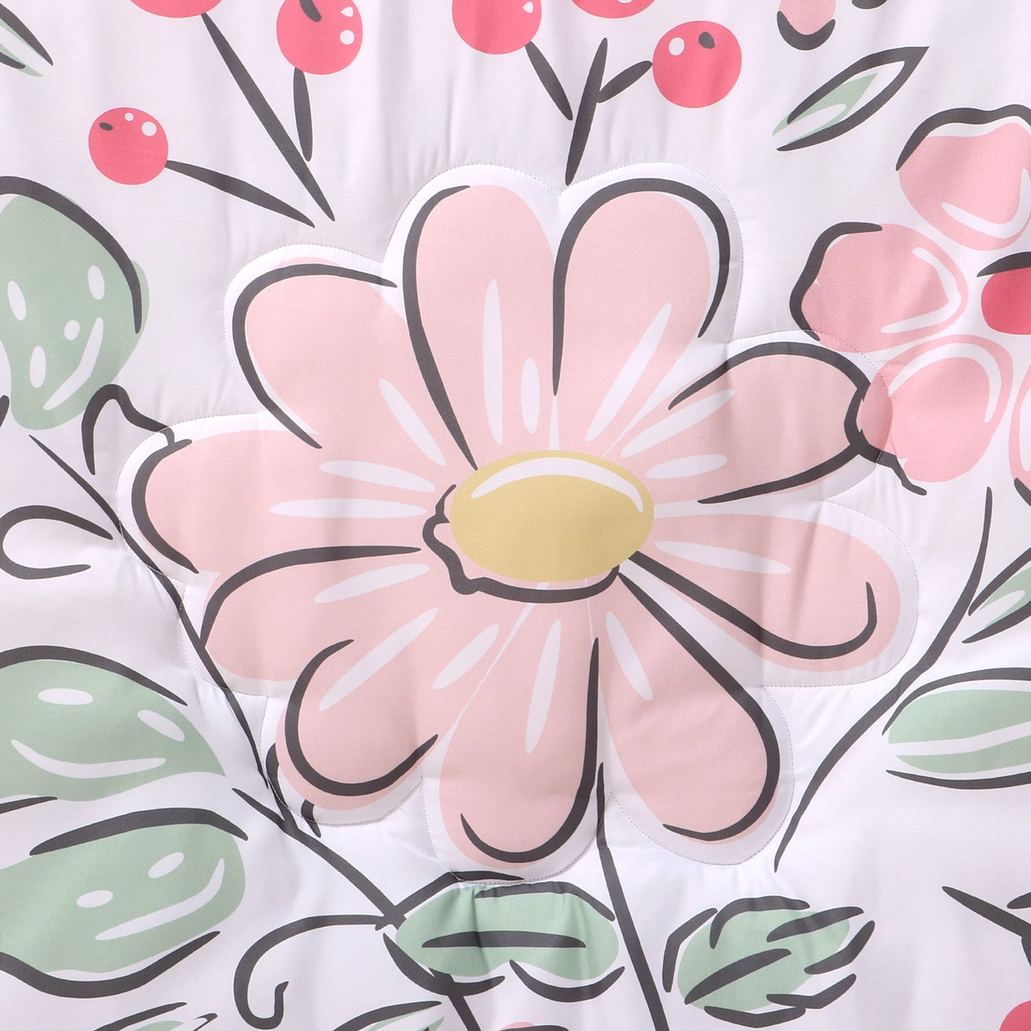 $41.27Fantastic flowers are scattered about in this 5 piece Floral Fun baby bedding set from The Peanutshell. Our generously sized 32″ x 41″ soft and cozy quilt features variously sized pink flowers, accented with pops of blue and yellow and outlined in a gray brush stroke. The gorgeously girly artwork is finished in a soft pink border. Two fitted crib sheets are included in this 5 piece nursery set. Both are a perfect universal fit, designed for a standard 28” x 52” crib mattress with snug fitting all around elastic. One sheet features large tossed florals, the second fitted sheet print features a smaller floral pattern. The pink and white flower striped bed skirt rounds out this feminine look. Our 30″ x 40″ burnout velour blanket with pink flower silhouettes is the perfect accessory for stroller walks or comfy cuddles