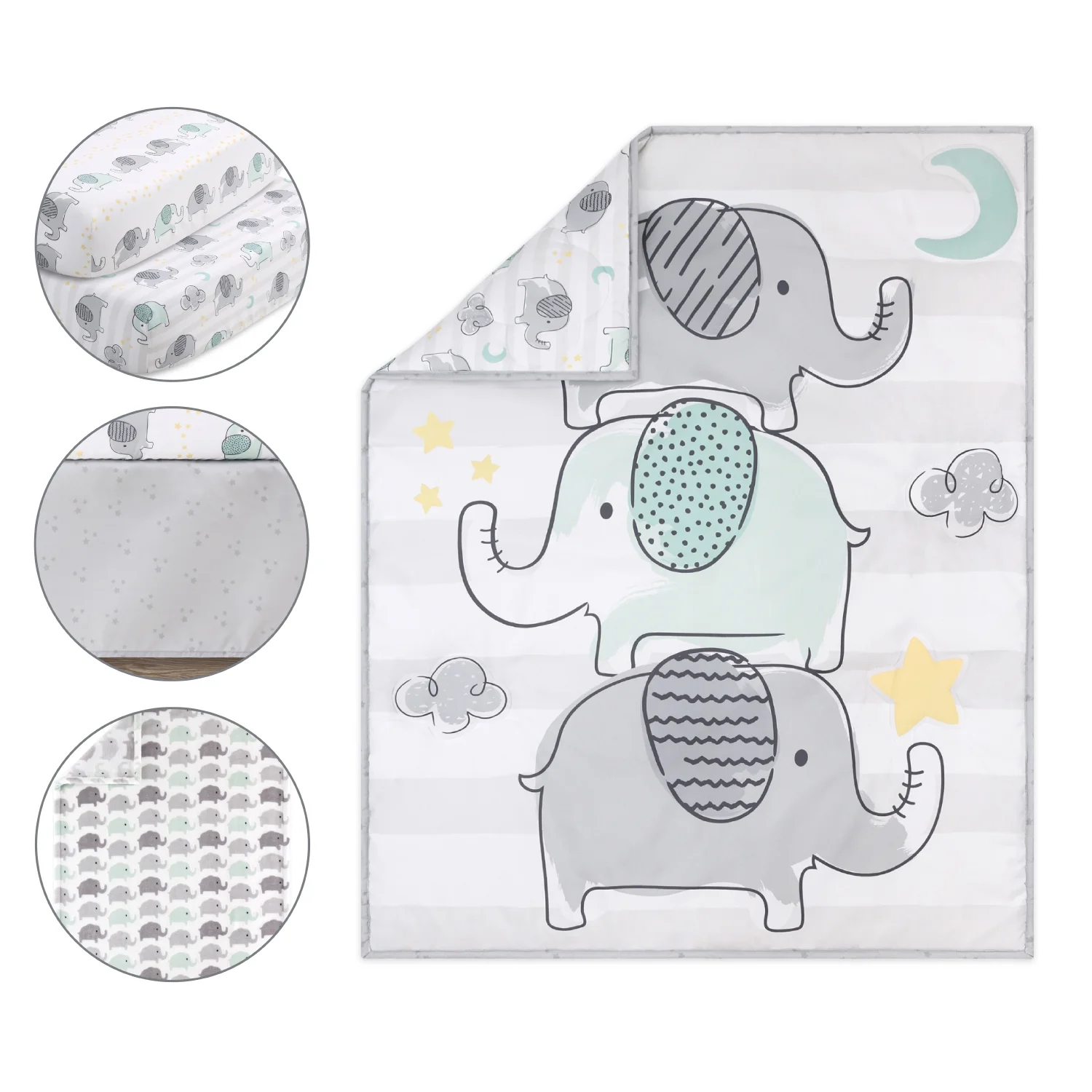 $38.69Original price was: $38.69.$30.95Current price is: $30.95.A stack of playful elephants stands tall in this 5 piece Elephant Dream baby bedding set from The Peanutshell. Our generously sized 32″ x 41″ soft and cozy quilt features a trio of gray and aqua elephant friends a top a wide light gray stripe and surrounded by a sky of moons, clouds, and stars. The quilt is finished in a gray border. Two fitted crib sheets are included in this 5 piece nursery set. Both are a perfect universal fit, designed for a standard 28” x 52” crib mattress with snug fitting all around elastic. One sheet features mint and gray elephants scattered among clouds, moons, and stars, the second fitted sheet print features a linear layout of parading elephants and rows of yellow stars. The tonal gray star printed bed skirt rounds out this gender-neutral look. The 30″ x 40″ burnout velour blanket with gray and aqua elephant silhouettes is the perfect accessory for stroller walks or comfy cuddles.