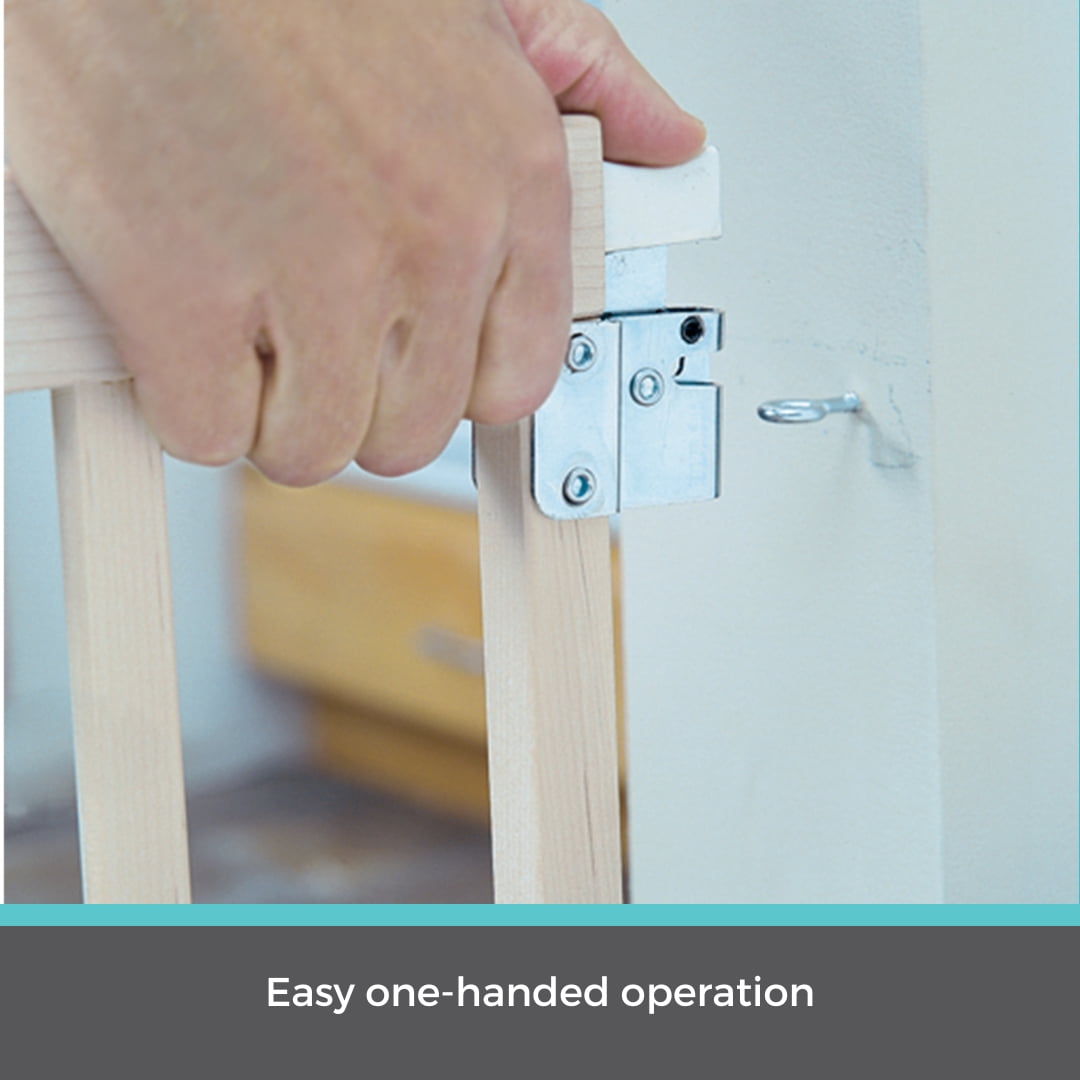 $37.83The Toddleroo by North States Extra-Wide Swing Baby Safety Gate helps keep your little explorer safe. This wood gate is designed to fit into extra-wide openings in your home, and it mounts easily and securely with all mounting hardware and brackets included. The gate opens and closes with one hand, and it removes and stores easily whenever it’s not in use. The Toddleroo by North States Extra-Wide Swing Gate is designed to fit in doorway or hallway openings and expands from 60 to 103 inches wide and stands 27 inches tall. The natural wood finish will stylishly blend into your home décor. As your little one becomes more adventurous, you’ll love the security and peace of mind that this baby safety gate provides.