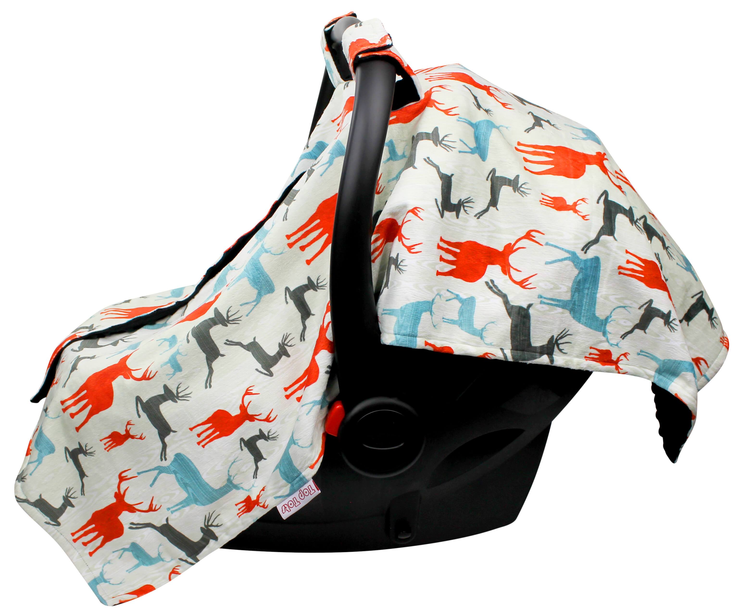 Top Tots Deluxe Minky Car Seat Canopy for Baby Boy or Girl, Red Blue Black Deer