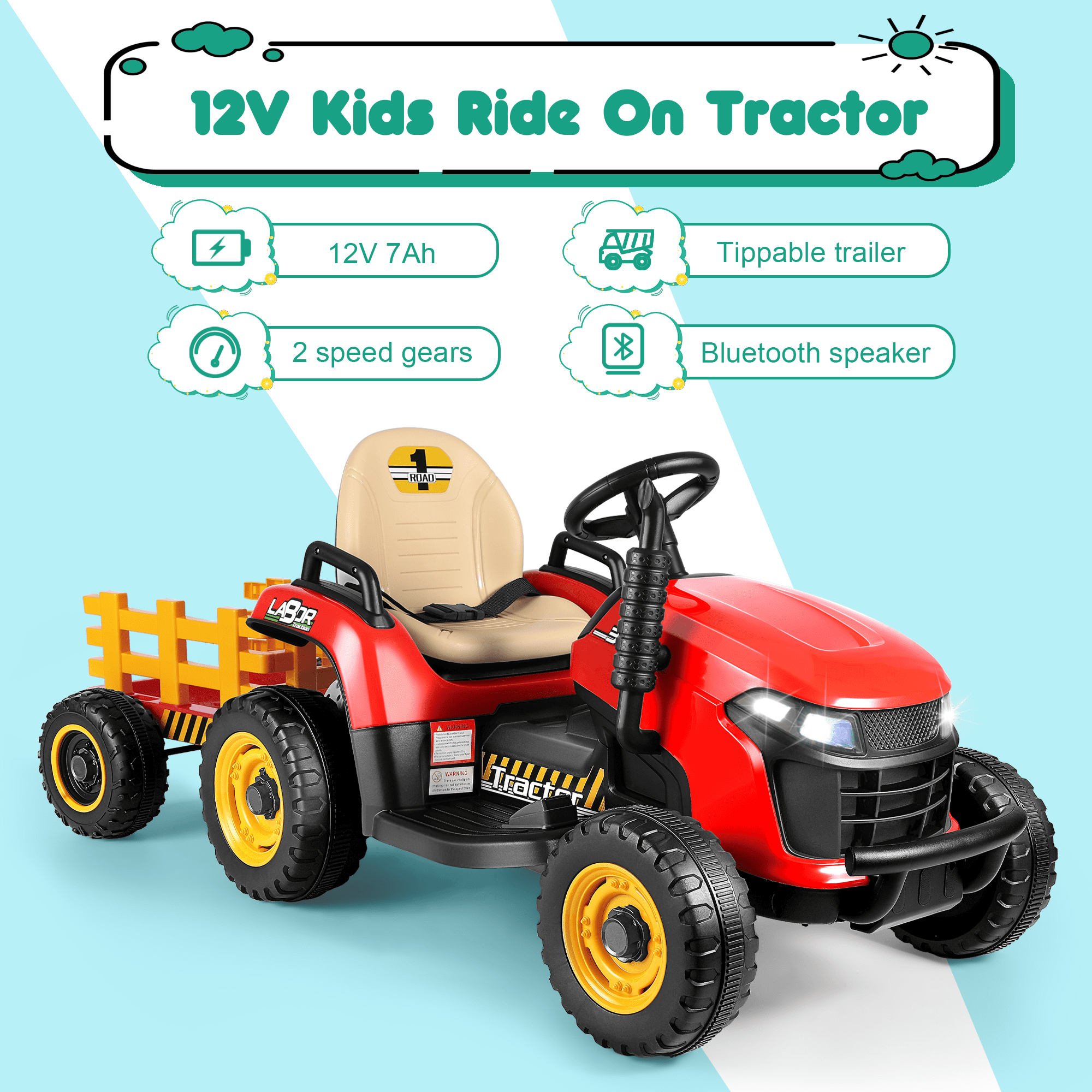 TOKTOO 12V Powered Ride on Tractor w/ Tippable Trailer, Remote Control, MP3, Bluetooth, LED light, Electric Car for Kids-Red