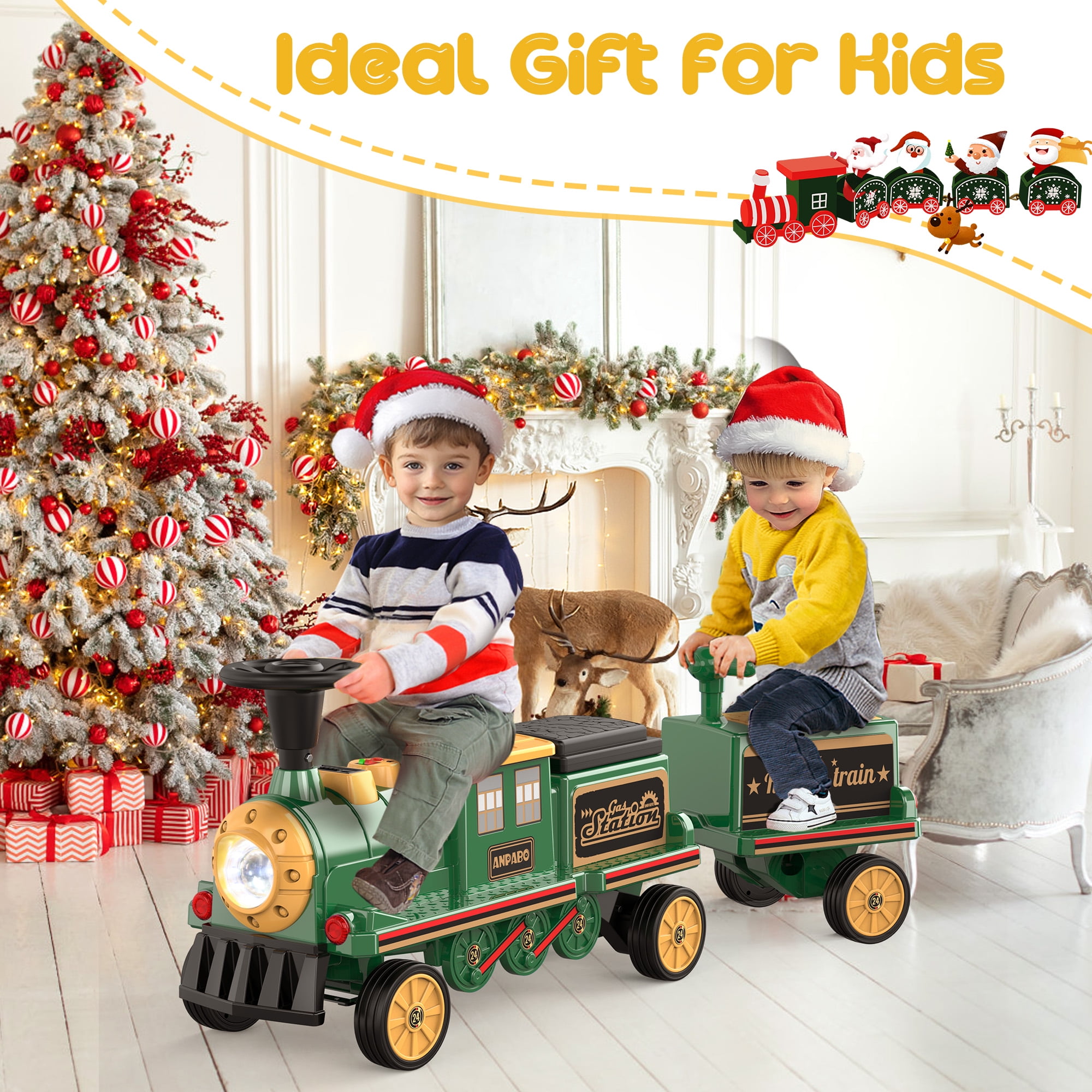 TOKTOO 12V Powered Ride on Train for Toddlers, Electric Ride on Car Toys w/ Rubber Wheels, Storage Box, LED Headlight, Music Player, Ideal Gift for Boys Girls, Green