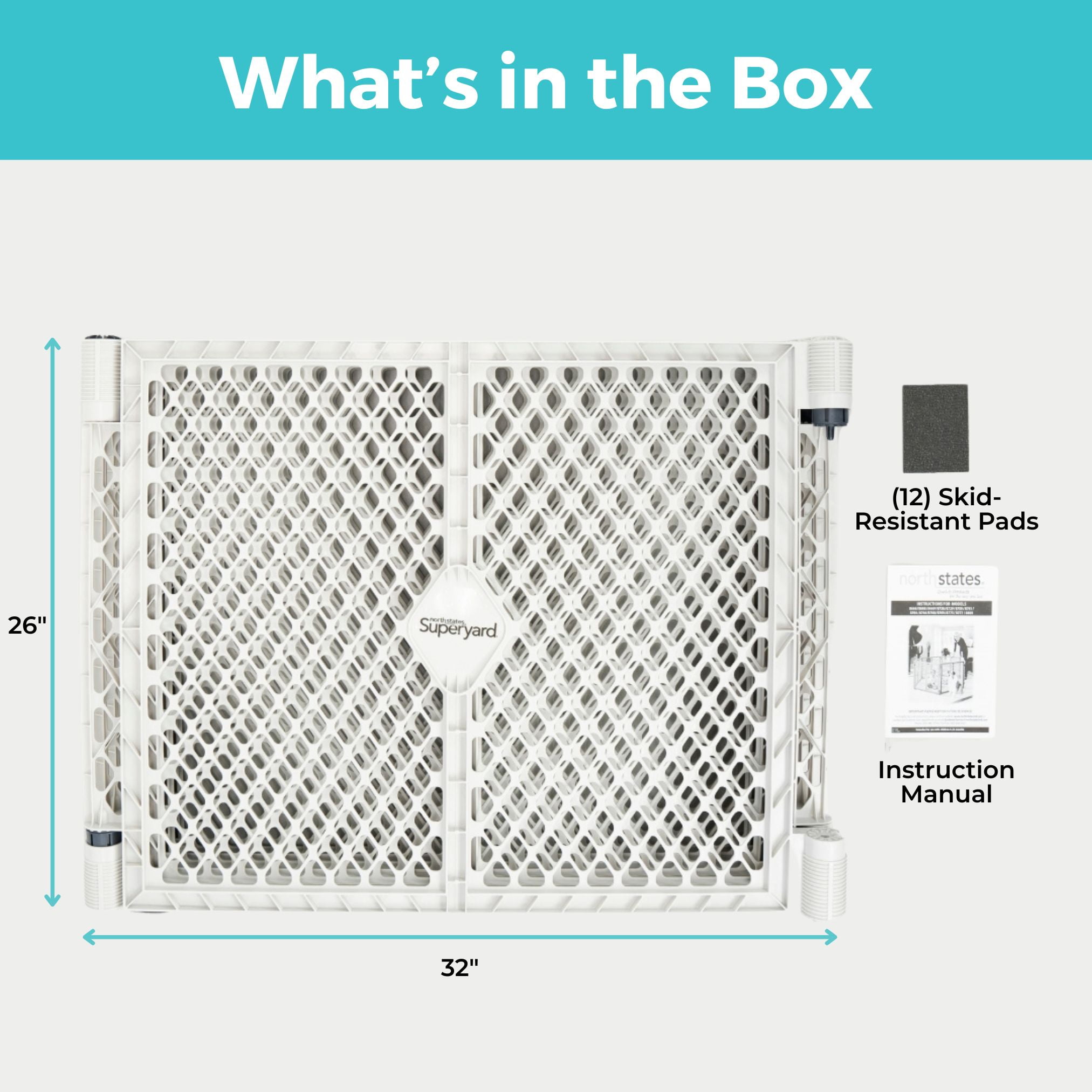 $54.89The Toddleroo by North States 3-in-1 Superyard Play Yard Two-Panel Extension connects to the 3-in-1 Metal Superyard to create a safe play area for your little explorer. This play yard is designed to act as a portable play yard, a gate, or a barrier. The additional panels increase the size of the Superyard from 10 square feet to 19 square feet. It adds an additional 48 inches when used as a barrier. As a play yard, this Superyard can be used on a variety of floor surfaces and stands 30 inches tall. As a gate or barrier, it can be mounted as an extra-wide barrier in your home, blocking off fireplaces, displays, and more. The swinging, walk-thru panel is built with a child-proof, double-locking system that allows for easy access. Plus, the light taupe color will stylishly blend into your home décor. As your little one becomes more adventurous, you’ll love the ease of setting up this play yard anytime.