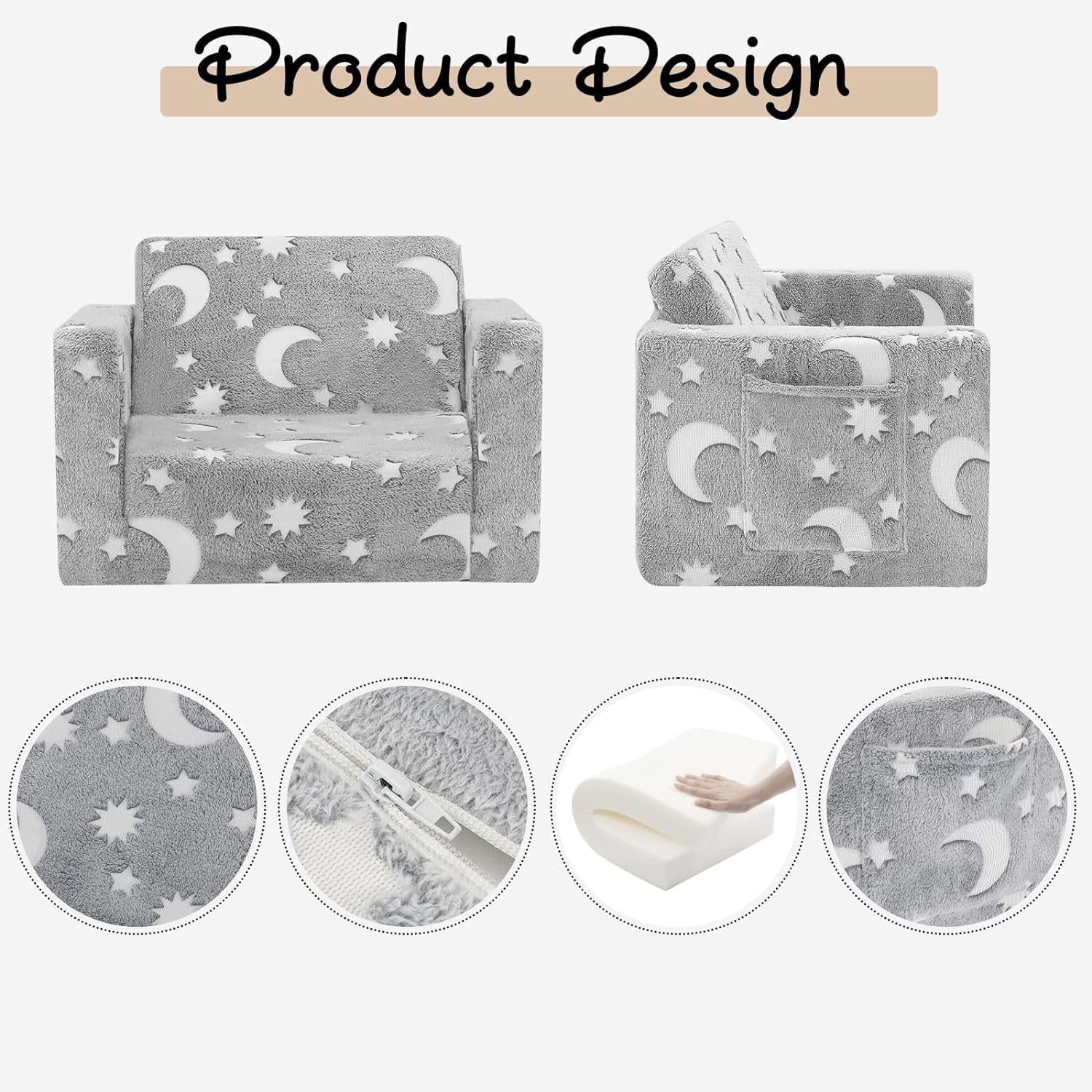 Toddler Couch, Toddler Chair Folding, Kids Couch 2 in 1 Kids Sofa Glow in The Dark Couch, Gifts Sleeper for Girls Boys – Gray Sky