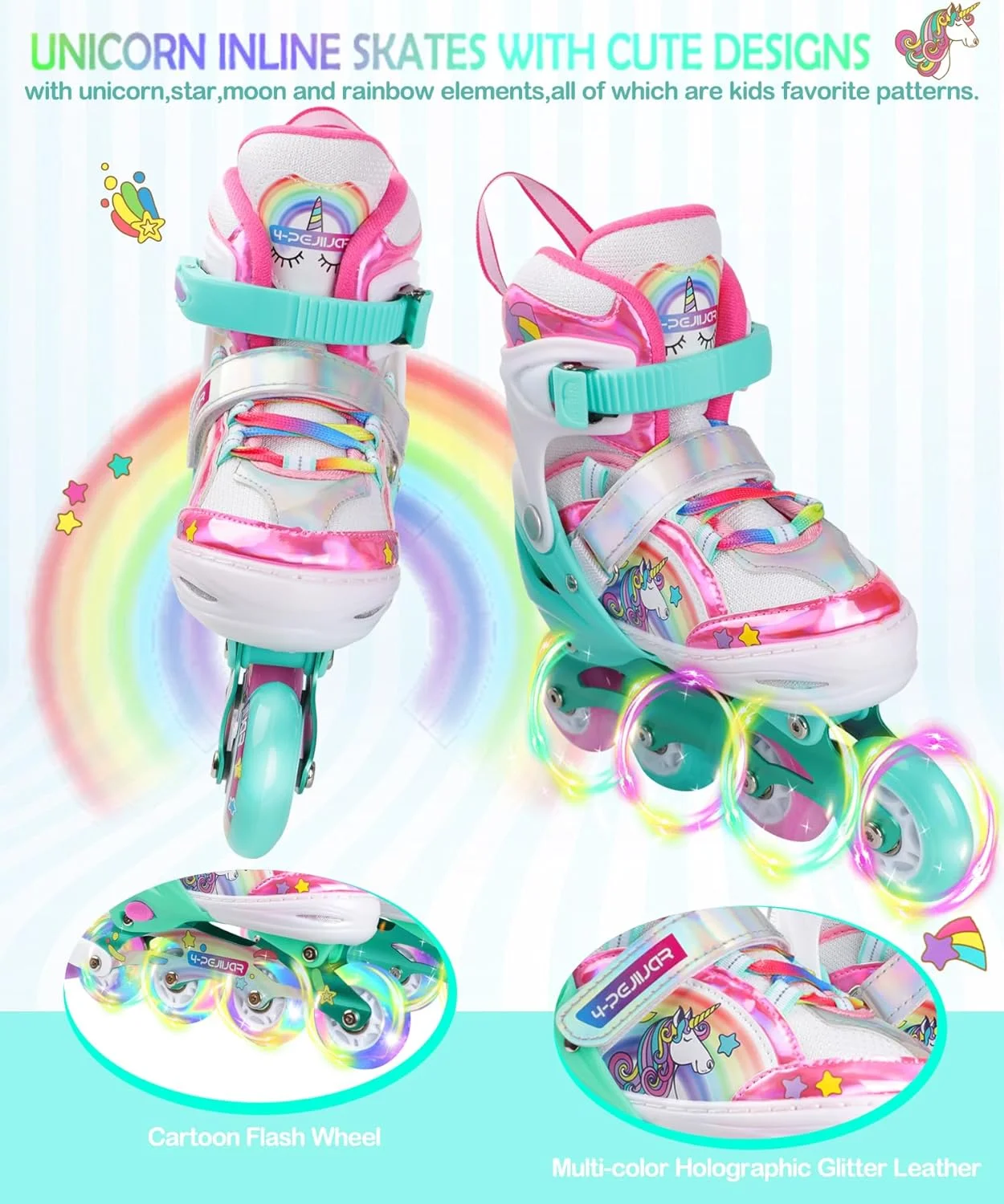 Unicorn Inline Skates for Girls Teens Womans,4-Pejiijar Rainbow Roller Skates for Girls Ages 6-8-12 w/Luminous Wheels,Kids Adjustable Roller Shoes for Birthday Xmas Gifts
