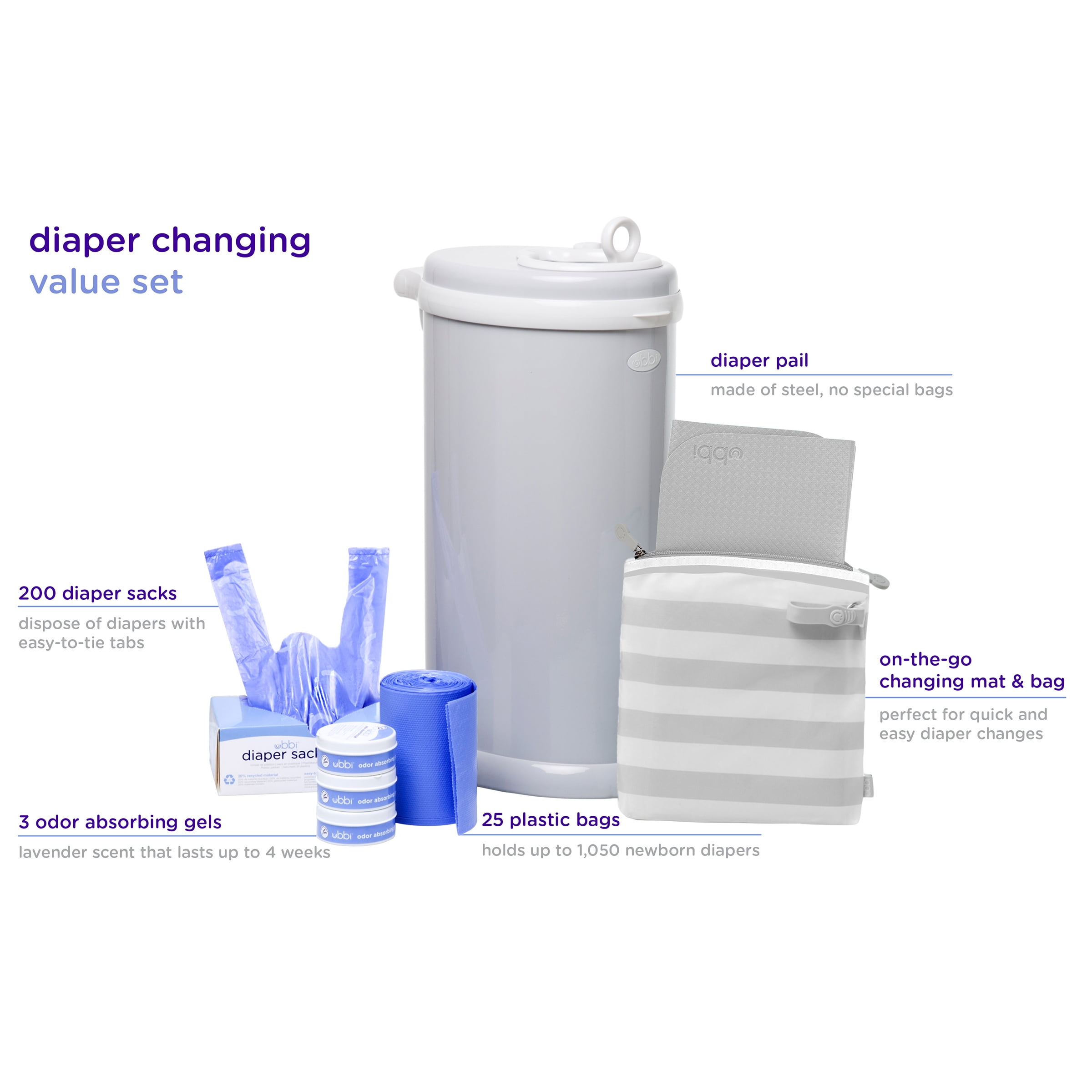 $85.99The Ubbi Diaper Changing Value Set includes a gray diaper pail, which unlike plastic, is made of steel and keeps the smell locked inside. No special bags or refills are required with the Ubbi diaper pail, saving time and money. Additionally, the pail holds up to 55 newborn diapers! The convenience of the included 25 pack of bags will get parents started at first and after, any bags can be used! Included in the kit are the value 3 pack of odor absorbing gels that subtle mitigate foul odors with a pleasant lavender scent. The gels are just a plus, not a must! The changing mat and bag is a great on-the-go diapering solution for quick and easy diaper changes, as it can hold a few diapers, travel size wipes dispenser, as well a phone, keys, or whatever else is needed for busy parents on-the-go. To round out the set are the 200 count diaper sacks, which provide a convenient disposal of stinky diapers with easy-to-tie tabs at home or on-the-go. This set makes the perfect registry essential or baby shower gift.