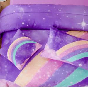 $46.44Original price was: $46.44.$34.05Current price is: $34.05.4 Pieces Rainbow Galaxy Teen Comforter Set for Girls, 3D Pastle Gradient Comforters Mysterious Nebula Comforter Bedding Set, Ultra Soft Lightwerght Kids Bedding Set with Comforter Sheets The gradient rainbow galaxy themed comforter set is specially designed for kids. This bedding set can stimulate children’s interest in exploring the mysterious universe. Adds an air of mystery to kids’ room. Meanwhile, This sparkle glitter comforter set, 3D printed highlights vivid color, very lovely, which makes the room more vibrant and vivid. The colorful and vivid design, bring a lively visual impact to your bedroom. Will be deeply loved by girls, boys and kids. Specification: Material: 100% Microfiber Polyester Size: Twin/Full/Queen Color: Blue/Purple/Tie Dye Blue/Tie Dye Pink Why Choose URBONUR Comforter Set: 1.Stylish Design: The gradient glitter rainbow pattern is a visually stunning and attention-grabbing design that can add a touch of glamour and sparkle to any surface. The comforter is reversible with contrasting colors. Side A is patterned, side B has no pattern, side B is A solid color of side A. The flat sheet and fitted sheet are solid colors, too 2.Soft Material: The comforter set is made of 100% brushed high grade fabric microfiber, not easy to wrinkle and fade. They are easy to maintain and can be machine-washed. They are also resistant to shrinking and stretching, making them ideal for use in bedding set because of lightweight. 3.A Perfect Holiday Gift for Your Loved Ones: The comforter set as a gift for your loved ones and freshness to her, whether it’s for Mother’s Day, Valentine’s Day, Father’s Day, Christmas, All Hallows’ Day or other holidays. About Our Store We are professional in making all kinds of Bedding Sets & Collections,such as Quilt Sets, Duvet Cover Sets, Bedspread-Sets, Comforter-Sets, Blankets and so on, high quality with cheap price.