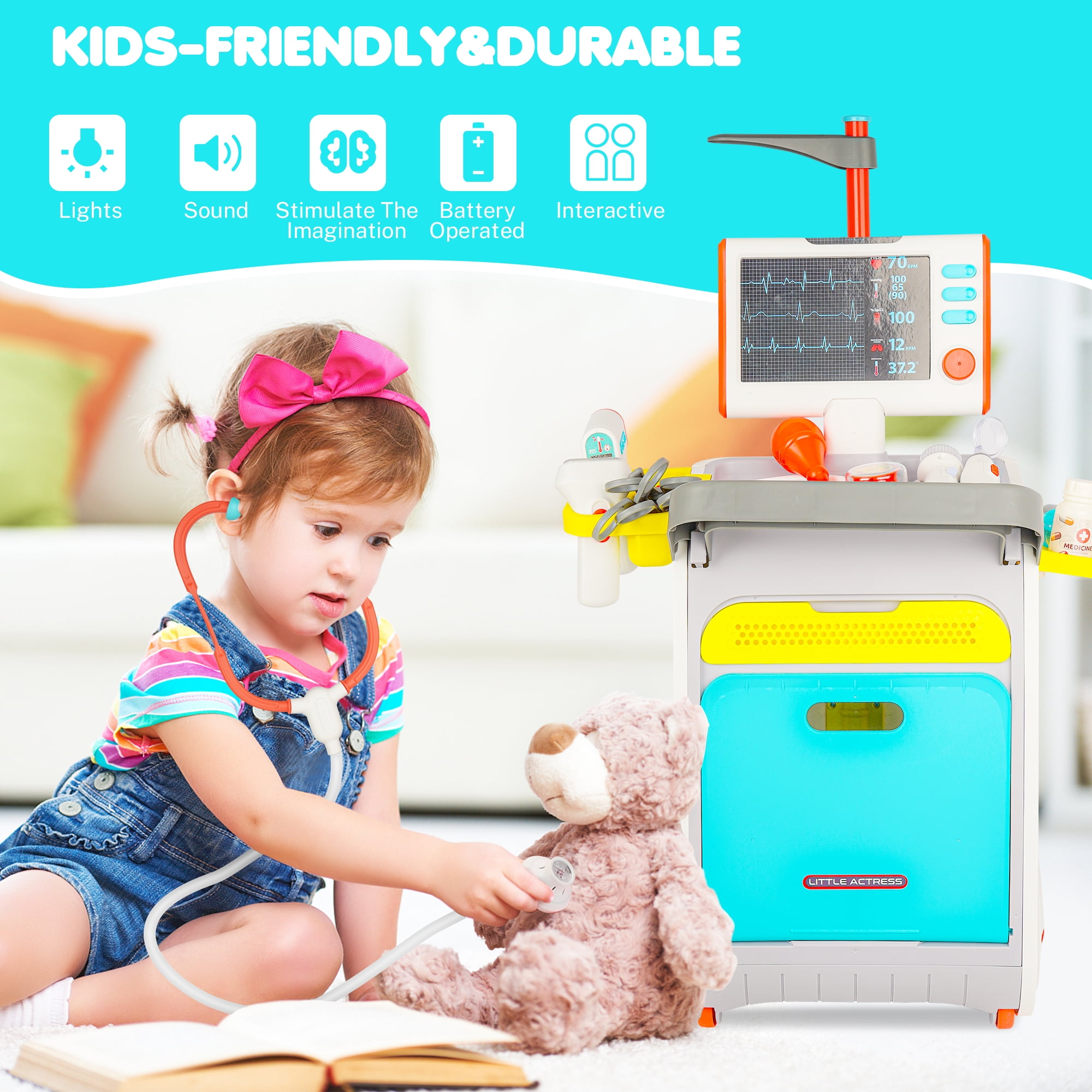 $42.12Do you have a kid who is dreaming to be a doctor? Are your children afraid of visiting the doctor? Do you want a toy to keep your baby entertained for hours? Our toddler doctor playset has rich accessories, and all doctor kits are stored in a sturdy and spacious medical kit box, it can help kids to understand what a career is to do and prevent or reduce their fear of doctor’s visits. There are over 21pcs doctor toys plus a multi-function mobile cart. Includes, height measuring rod, thermometer, card, syringe, stethoscope, reflex hammer, DIY stickers, etc. In the process of playing, they will also ask more questions and think! Practicing “doctoring” on a toy or pet is a great way for children to develop their nurturing and caregiving skills. This can be especially useful for strengthening their imagination, creativity, and manual ability by familiarizing them with these medical doctors’ equipment. Great to be a toy or gift for both boys and girls on birthdays, Christmas, holidays, and more. Specifications: Item Name: Pretend Medical Station Set Use Age: 3-5 Year Olds Material: ABS Size&Weight: Product appearance size: 16.92″L x 11.81″W x 22.44-44″ H Package size: 18.89″L x 4.72″ W x 16.14″H Package weight: 4.63lbs Package Includes: 1 x Medical Station 21 x Accessory
