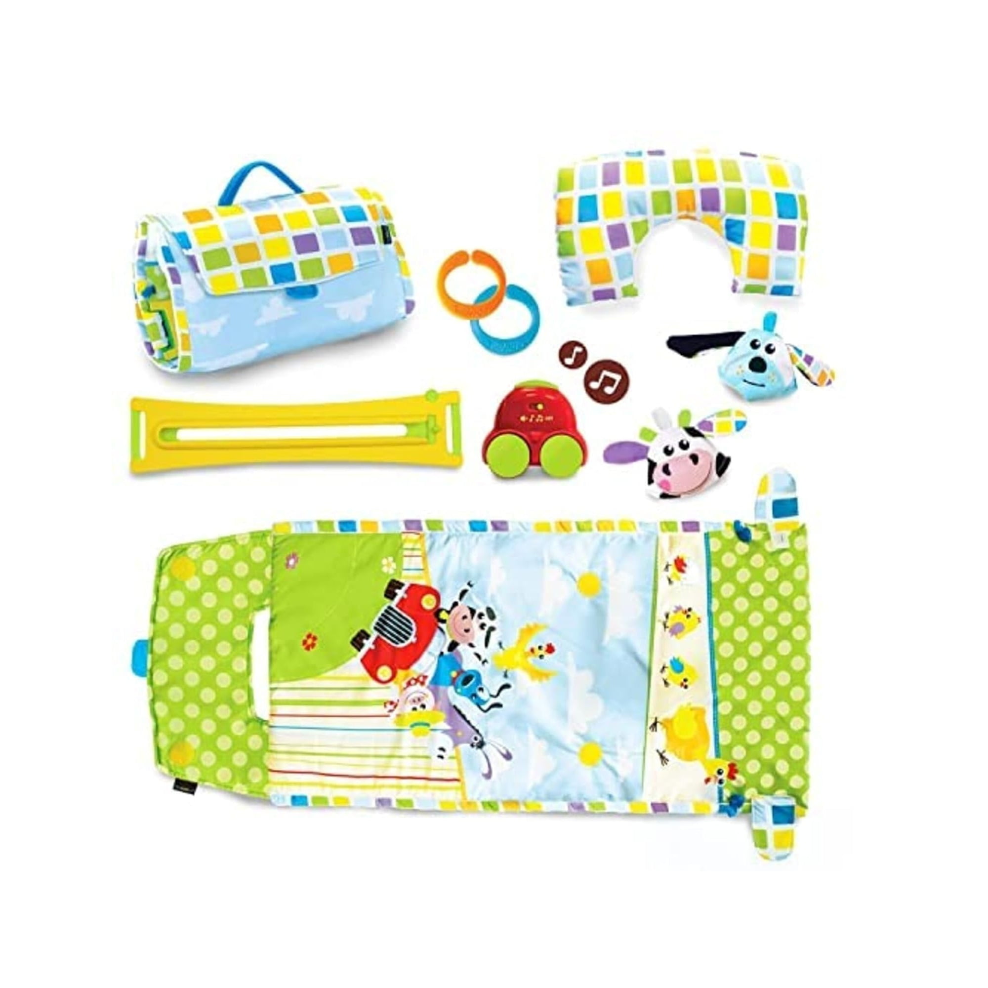 $37.80Introducing the Gymotion® Tummy Time Playland™ – a fun way to make tummy time engaging for your infant. Featuring the motorized Yookidoo Magic Motion Track™, two farm figures ride back and forth, encouraging head turning and eye-tracking. The play mat comes with a large, colorful tummy time pillow for support. Enjoy 10 minutes of “Old McDonald” music with the silent mode option. Conveniently folds into a self-contained roll-n-go carry case. This unisex product promotes various developmental benefits during tummy time, including head-lifting, focus improvement, eye-hand coordination, and more. A must-have for your baby’s playtime!