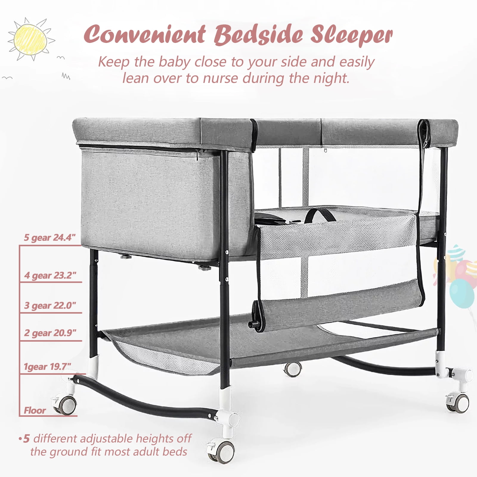 $137.59Original price was: $137.59.$85.99Current price is: $85.99.Imagine how comfortable it is to have your baby sleep safely and comfortably in our Yadala bedside bassinet while you are asleep. With the bedside sleeper mode, you no longer have to worry about the trouble of getting up in the middle of the night. Simply unzip the side panel closest to your bed and snug the baby crib right up to the side. Let your baby accompany you to the place closest to you, and at the same time, it can be more convenient to take care of the baby. The silent 360°swivel wheels help you to easily move the sleeping baby to the bedroom, living room, or dining room. The Yadala bassinet for girls and boys is also a great baby shower gift if you need to send that to your family or friends.