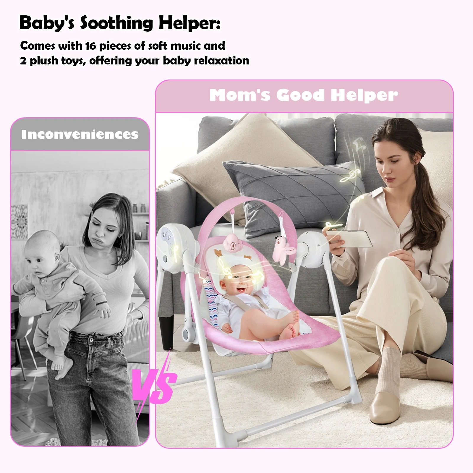 Yadala Baby Swing, Foldable Baby Swing for Infants with 5 Speed, 12 Music, 0-12 Months, Pink