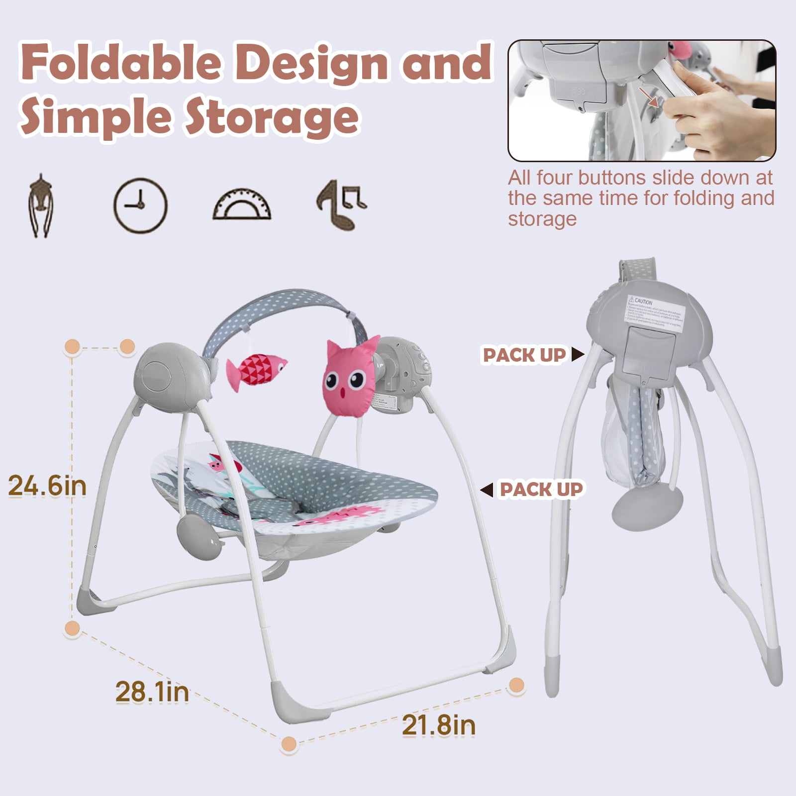 $68.79You are getting a reliable place to keep the baby while you are doing some household stuff with baby swings. You can choose and combine what your baby likes best, extra quiet motor makes swinging peaceful and sway into cozy comfort. With the remote, you can adjust all of the Swing features, including music playback, timer control, and more. The seat pad can be removed and tossed in the washing machine, while the Double-Sided fabric seat is suitable for year-round use. Easy to assemble, portable and easy to carry anywhere, suitable for small places.