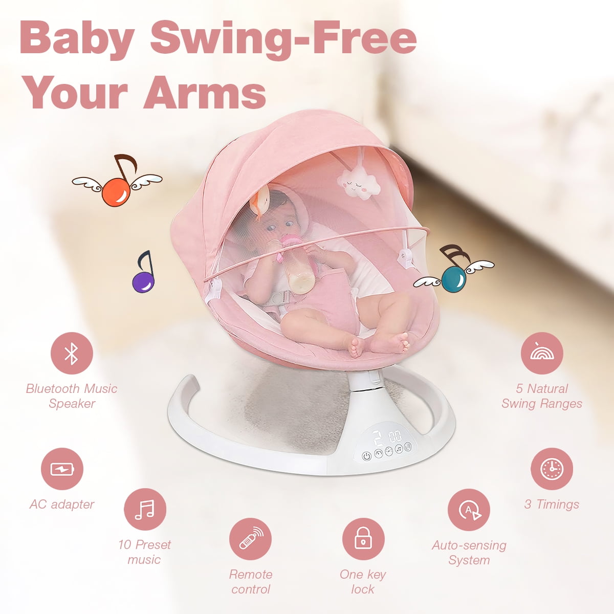 Yadala Electric Baby Swing, Portable Baby Swing for Infants Bouncer for Boy Girl with Bluetooth, Remote Control, 5 Speeds, 10 Music Pink
