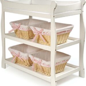 $163.39Original price was: $163.39.$94.60Current price is: $94.60.Badger Basket’s Modern Baby Changing Table with Hamper and Three Baskets is a practical and stylish place for diaper changing and getting the baby ready for the day. Includes a large hamper and three baskets. The hamper is fully removable leaving you a convenient spot on the changing table for your diaper pail. Includes a changing pad and safety belt, too. When Baby outgrows this table, it becomes a useful piece of furniture for organizing toys and more. Safety rails enclose all four sides around the top of the table. A metal support bar beneath the changing surface provides additional stability. Hamper and baskets fold for storage. Changing Table frame is made with multi-layer solid wood, and the shelves are engineered wood with veneer. All paints and finishes are non-toxic. The outside fabric on the baskets is 80% Polyester/20% Cotton. Inside lining on the baskets (including the bottom panel) is a non-woven fabric. Changing pad is polyurethane foam covered with wipe-clean PEVA (non-PVC) vinyl. Overall unit measures 34.25 inches W x 20.75 inches D x 34.5 inches H. Hamper measures 13.5 inches L x 13.75 inches D x 21.5 inches H. Baskets measure 14.25 inches L x 17 inches W x 7 inches H. Changing pad measures 31.5 inches L x 17.5 inches W x 1 inch H. All measurements are approximate. Wipe and spot clean as needed. Basket color depends on the color of the table (baskets are either White or Ecru). The changing table is for use with children weighing up to 30 lbs. (13.6 kg). Adult assembly required. Illustrated assembly instructions included. Meets all currently applicable testing standards. The product may vary slightly from shown and described. Props/accessories shown are for illustration purposes only and are not included with the product. The actual color/finish may vary slightly from the screen display. This item ships in its original carton which may include a product photo.