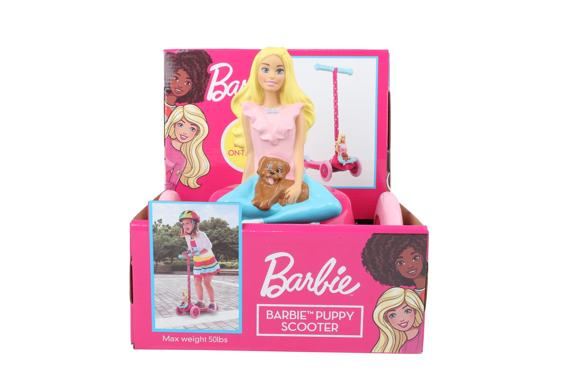 $54.34Ride around and play all day with your one-of-a-kind Scooter! With a unique 3d design this scooter looks just like a Barbie doll on the front and is perfect for boys or girls who love Barbie! This 3 wheeled push scooter is designed with a stable platform to foster balance and coordination and safe-roll wheels to keep the beginner scooter rider safe and in control while learning the basic motor skills of balance and coordination. With easy tilt and turn steering, 3-wheel platform and a foot-activated brake, this scooter is tons of fun! For ages 3 and up. 75 lbs maximum weight capacity