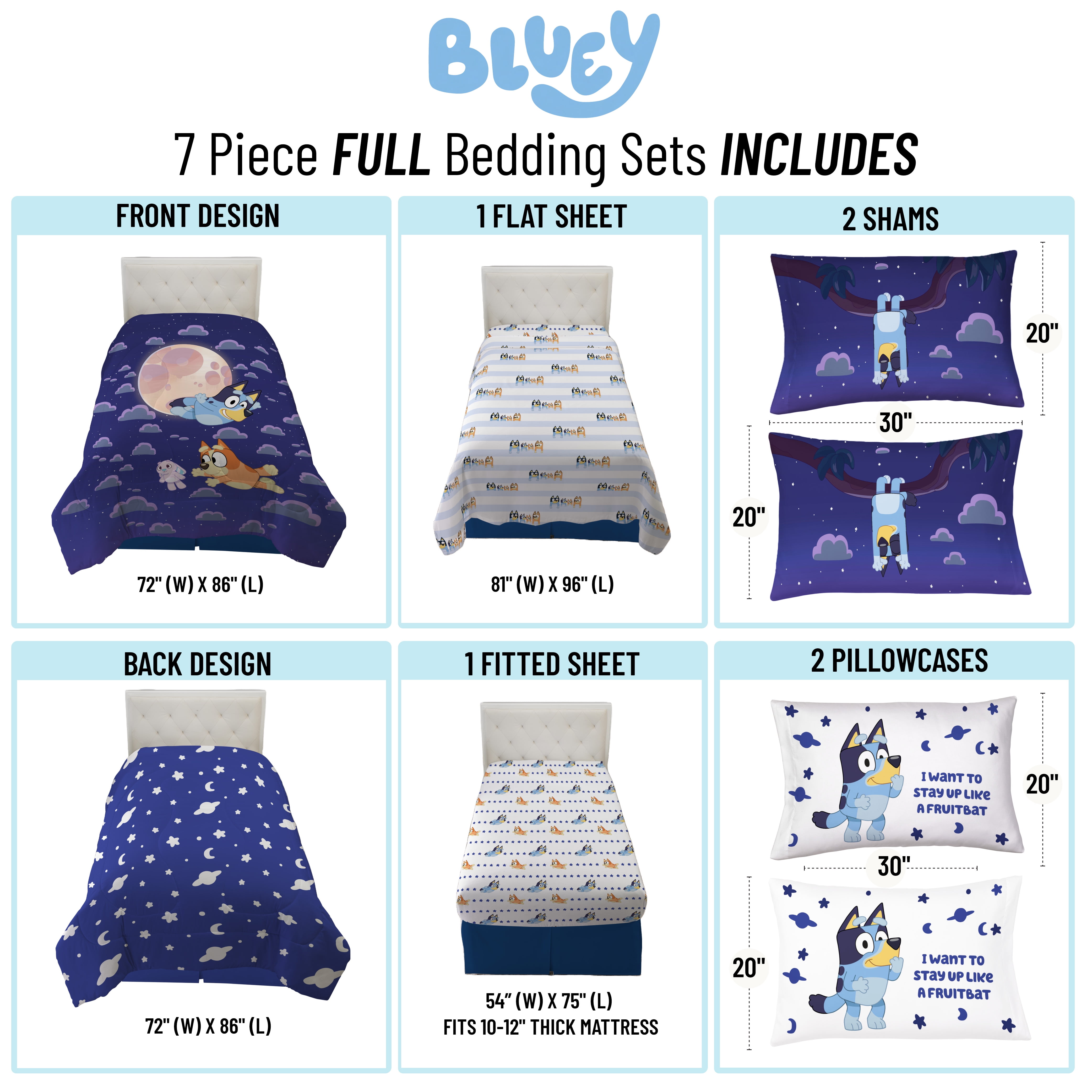 $44.70Soar through the night sky with this Bluey 7 Piece Full Bed Set with Sham. Set includes a comforter, two shams, fitted sheet, flat sheet, and two standard sized pillowcases. This deeply hued bed set features Bluey and Bingo soaring through the night sky. Made from 100% Microfiber, this bed set is the perfect weight to keep you comfortable all year round. Simple care instructions include machine wash cold and tumble dry low. Complete the look by shopping our other Bluey home and bedding items, sold separately on .