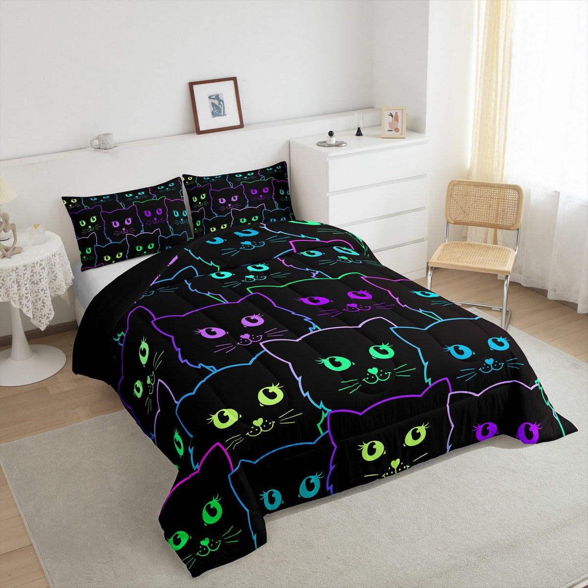 Bedding Sets Full Size Cats Comforter Set Cartoon Pet Animal Quilted Duvet Set Black Neon Kawaii Kitten Bed Comforter Set Teens Gradient Line Cat Gifts Duvet Insert 3Pcs