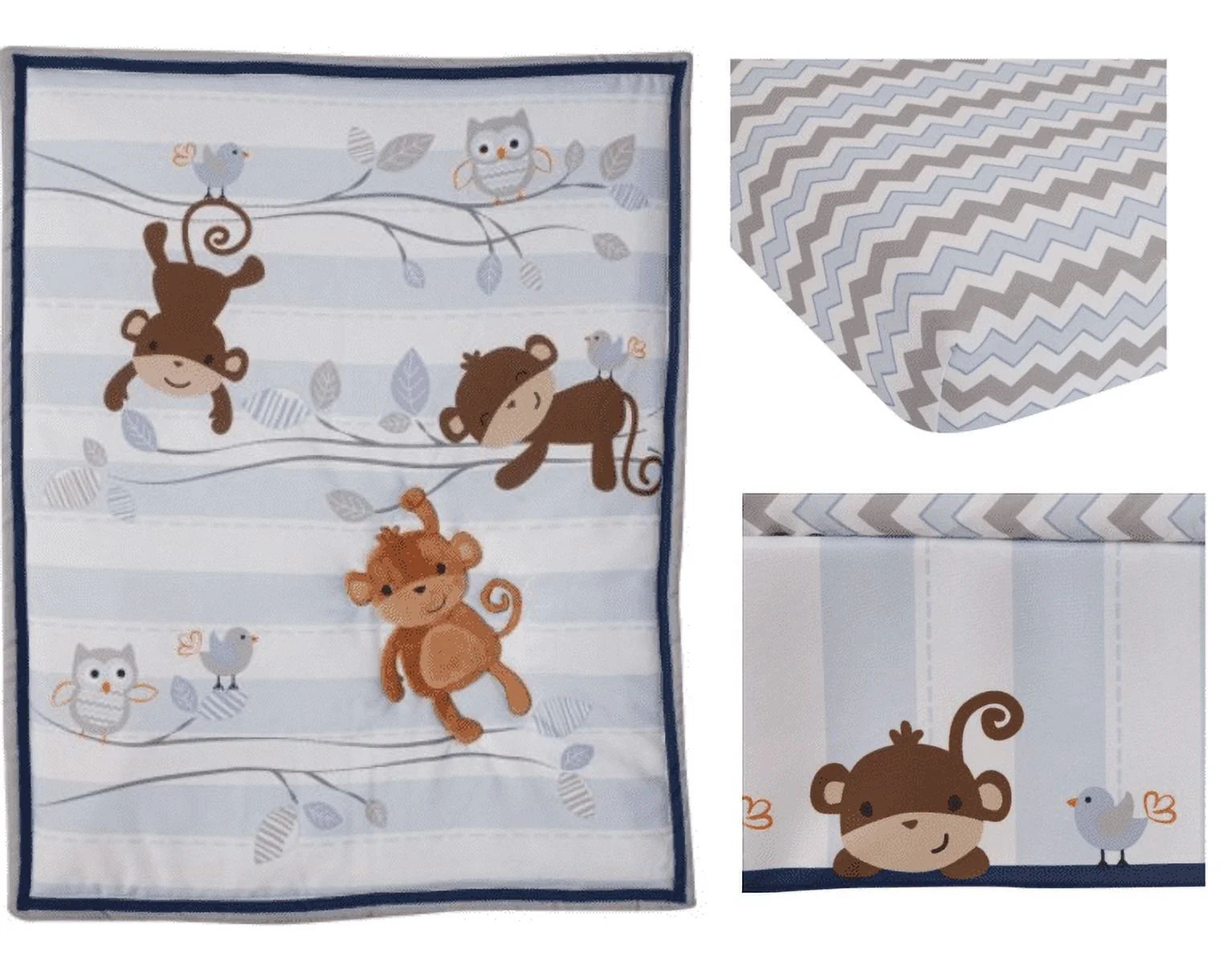 $39.65The 3-piece bedding set includes a quilt, fitted sheet, and dust ruffle. The quilt is 34″ x 43″ with a 100% polyester fiberfill and features an appliqued monkey in the center. Reverses to a trendy chevron print on the back. Color palette is in hues of blue, gray, white and a touch of charcoal. Our sheets fit a standard 28″ x 52″ crib mattress. The dust ruffle has a 9.5″ drop. Collection is a cotton/poly blend. A perfect collection to welcome home your little one.