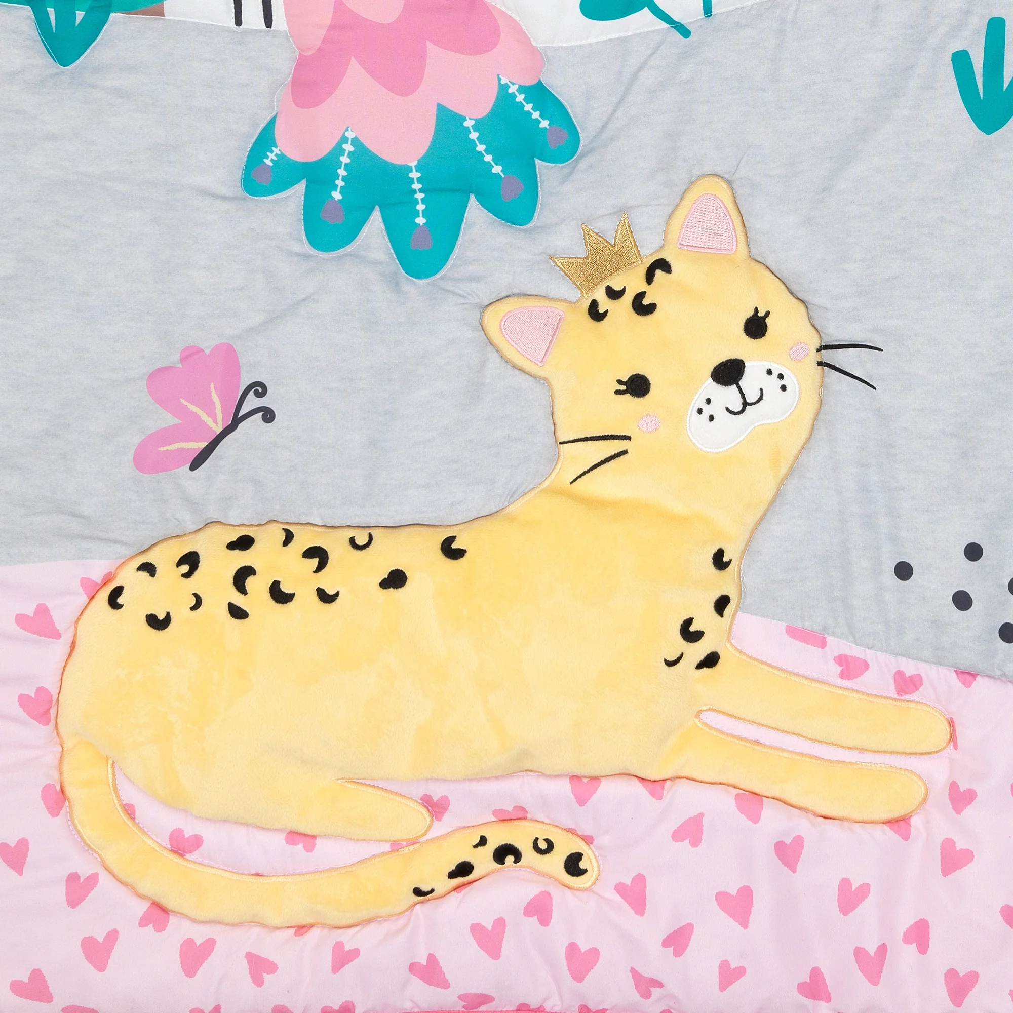 $55.89Welcome home your little one with this colorful jungle inspired collection. This three-piece crib bedding set includes one quilt, one fitted crib sheet and one crib skirt. It is made in a super soft microfiber material. The quilt features a fully appliqued yellow velour leopard with embroidered black spots resting on a pink heart ground. She has a metallic gold crown on her head. She is surrounded by Cherry, the elephant, who is standing on a heather gray color ground, Petunia, the peacock, along with trees, flowers, rainbows, and butterflies. The adorable, fitted crib sheet features our cute animals, plush trees, flowers, rainbows and leaves on a crisp white ground. The fitted crib sheet has elastic all the way around ensuring a safe and secure fit on a standard size crib mattress measuring 28” X 52”. The crib skirt adds the finishing touch to your child’s crib. The top panel is a heather gray color and has a pretty pink border. On the right side of each panel is the leopard with an arched rainbow.
