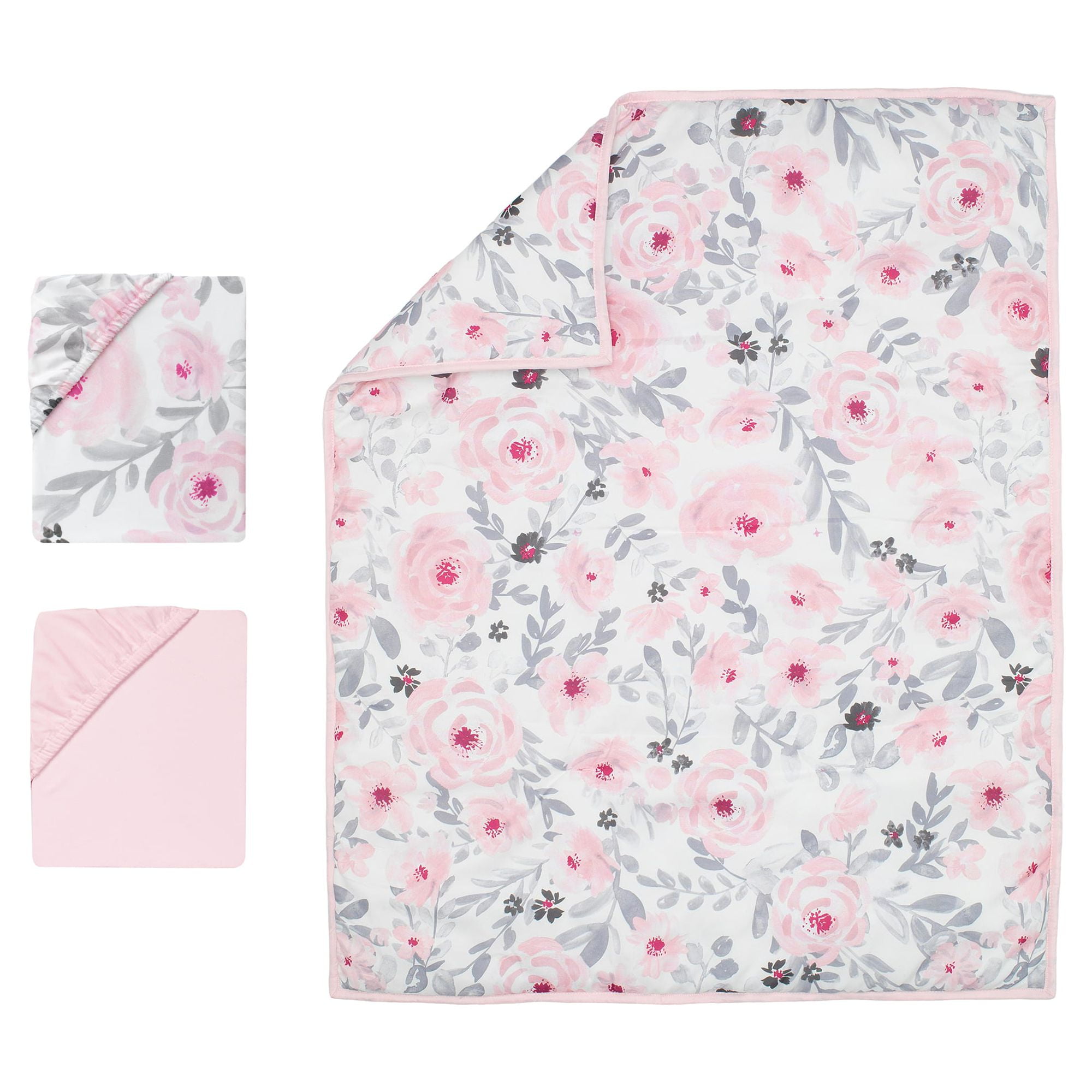 $60.19Original price was: $60.19.$51.59Current price is: $51.59.The perfect way for your little one to transition from their crib is into a toddler bed. They share the same size mattress making switching a snap. This toddler bedding set includes one quilt (42” X 57”) one fitted bottom sheet, one top sheet and one standard size pillowcase. A gorgeous floral watercolor print in pinks and grays decorates the quilt, fitted bottom sheet, top sheet, and a standard size pillowcase with a solid pink 3 ½” border. Made in a silky soft microfiber fabric this is sure to please your little toddler. The fitted bottom sheet is 28” X 52” and has elastic all the way around ensuring a safe and snug fit on a standard size crib/toddler mattress. The top sheet is 44” X 61” and the pillowcase is 20” X 31 ½”.