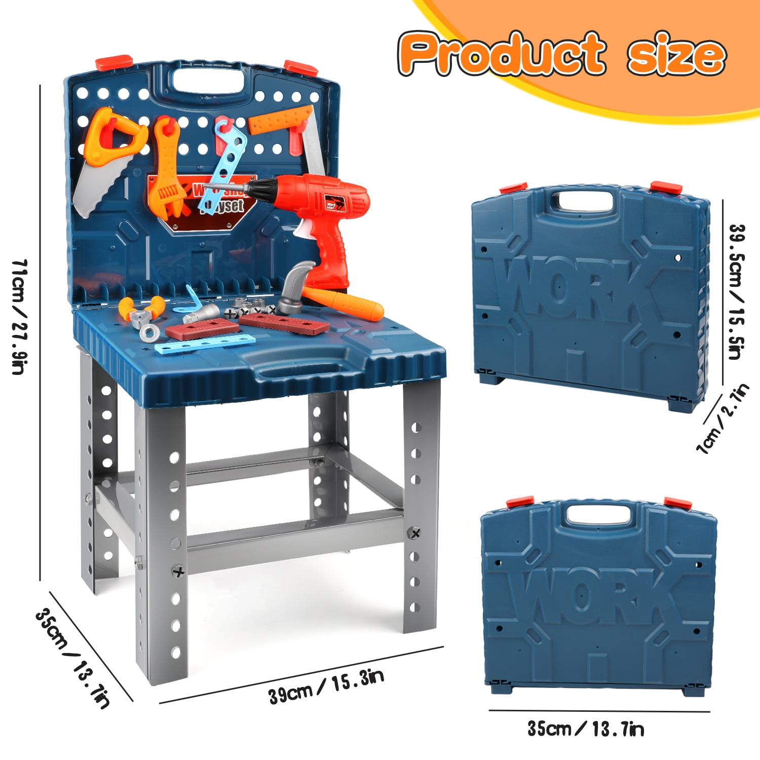 $37.83Original price was: $37.83.$33.27Current price is: $33.27.From Pretend Workbench to be a little mechanic, little ones have everything they need to build big things Girls and Boys Tool Bench Workshop. The variety of pretend work tools over 50 pcs accessory set makes anything possible. The working spring action vise keeps projects stable as little ones build. The toddler workbench includes features that mimic real workbench necessities such as a drill and built-in pretend table saw. Accessories include realistic pieces made of flexible foam with holes and cutouts for easy assembly. As they play, little ones will develop their fine motor skills as they hammer, saw, and drill. Plus, the large design workbench is ideal for kids to practice stimulating social play with friends. This indoor/outdoor play tool set for toddlers features unmatched strength and durability, so it?s ready to outlast hours of playtime fun. Assembled dimensions: 15.3″ x 13.7″ x 27.9″. Includes: Toddler bench workshop; over 50 pcs tool toys accessory set.