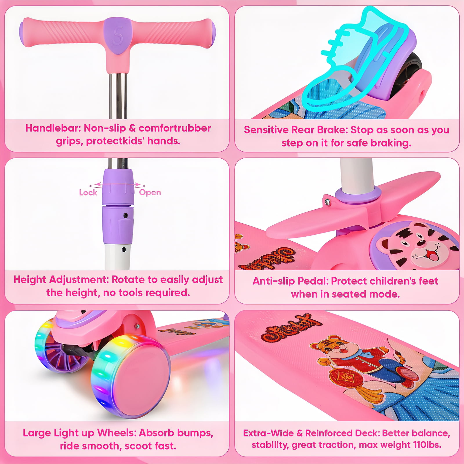 Besrey Kids Scooter 3 Wheel for Ages 3-10 Years Boys/Girls,Kick Scooter forToddler with LED Light Wheels and Adjustable Height,Pink