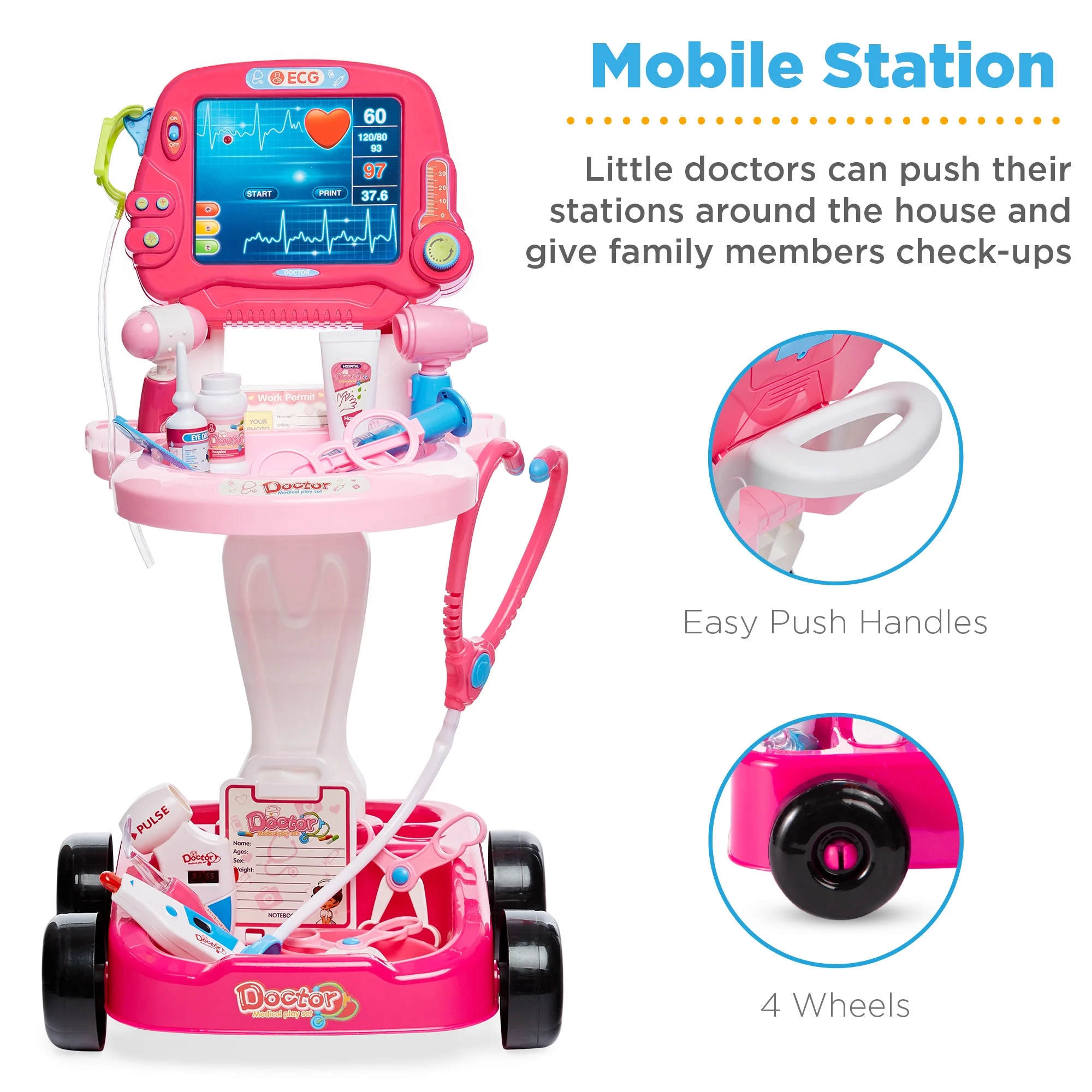 $63.63Original price was: $63.63.$25.79Current price is: $25.79.Kids don’t have to wait until they grow up to experience the fun of being a doctor! They can experience fun gadgets just like a doctor with this colorful medical mobile cart and 17 pieces! Little doctors can push their stations around the house with push handles and 4 wheels and give family members check-ups with toys like an EKG machine, pulse machine, and more! 5 LED accessories are included like an oral mirror, thermometer, otoscope, and pulse machine. And with over 10 other doctor’s gadgets, your child will want to play again and again. This toy is made with safe materials that meet U.S. Federal Safety standards and is ASTM F963-17 and CPSIA certified making this a safe and fun option for playtime! Product Specifications: Cart Dimensions: 14″(L) x 13″(W) x 24″(H), Cart Shelf to Floor: 14.5″(H), Accessory Carrier: 10″(L) x 4″(W) x 8″(H)
