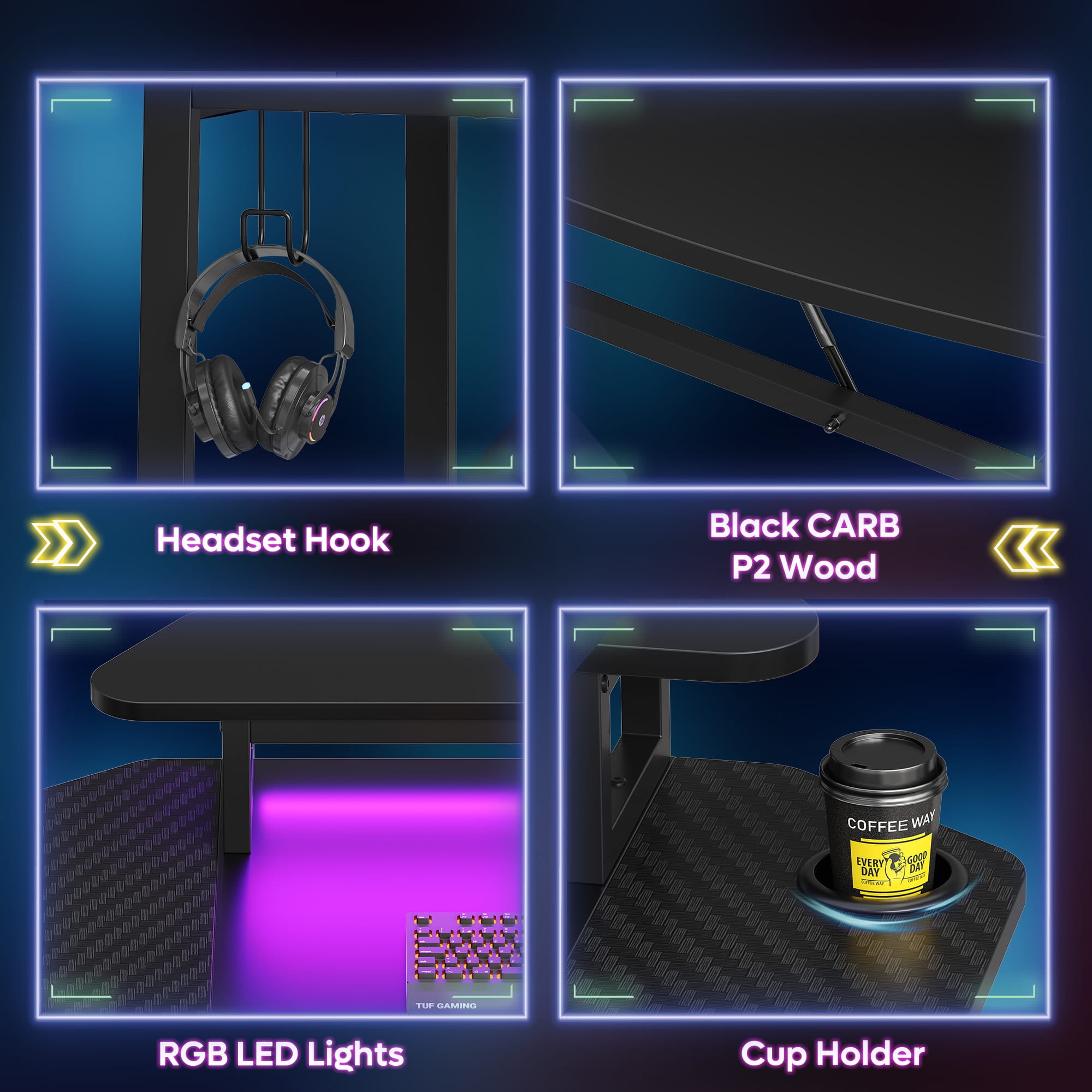Bestier Gaming Desk 63″ Ergonomic Computer Table with LED Lights Monitor Stand Cup Holder, Black