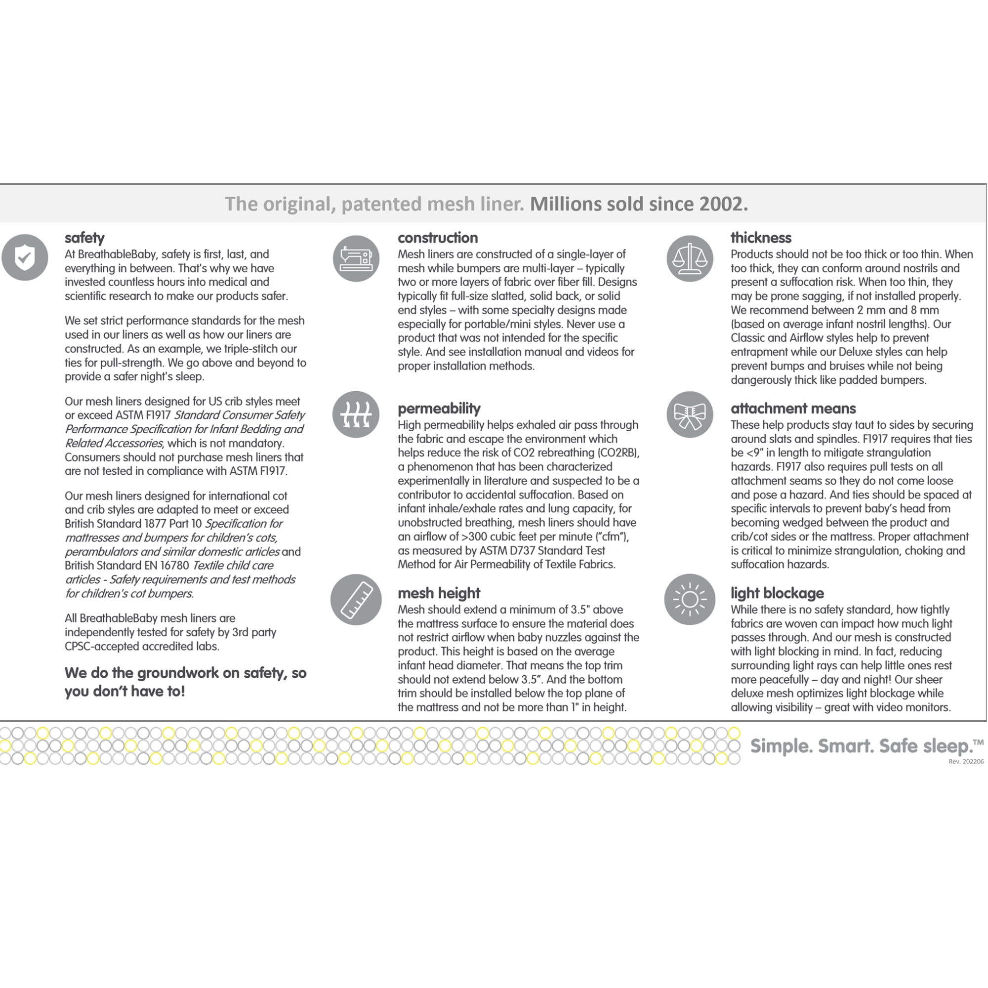 $41.25At BreathableBaby, safety is first, last, and everything in between. That’s why we have invested countless hours into medical and scientific research to make our products safer. We invented and perfected the breathable mesh liner. Too many babies get their arms or legs stuck in between slats, which can be painful for babies – not to mention scary and exhausting. So we created the mesh liner to simply and safely solve the problem. The original breathable mesh liner with millions sold since 2002. Unlike padded bumpers, our mesh liners keep little limbs safely inside without the risk of restricted airflow. BreathableBaby is all about helping caregivers feel confident and in control – and get some sleep! Simple. Smart. Safe Sleep. Only from BreathableBaby, of course.