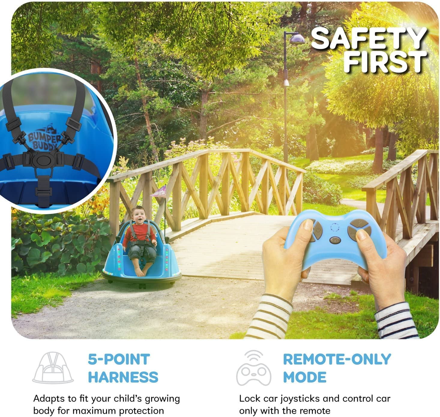 $171.99Bumper Buddy Blue 12V 2-Speed Ride on Electric Bumper Car for Kids & Toddlers, Boys & Girls Remote Control Baby Toy Gifts Cars Toys for 18 Months Toddler-5 Year Old Kid The most advanced and toddler-friendly ride-on bumper car for kids yet! Our baby bumper car is engineered for maximum performance, fun, ease of use, and safety. The only kids bumper car with two-speed modes & built-in music. The only toddler bumper car that provides a 5-point harness to maximize safety. Includes exciting blinking lights. Special Parent-only mode for added peace of mind. A soft foam bumper will protect the furniture and walls from impact damage.