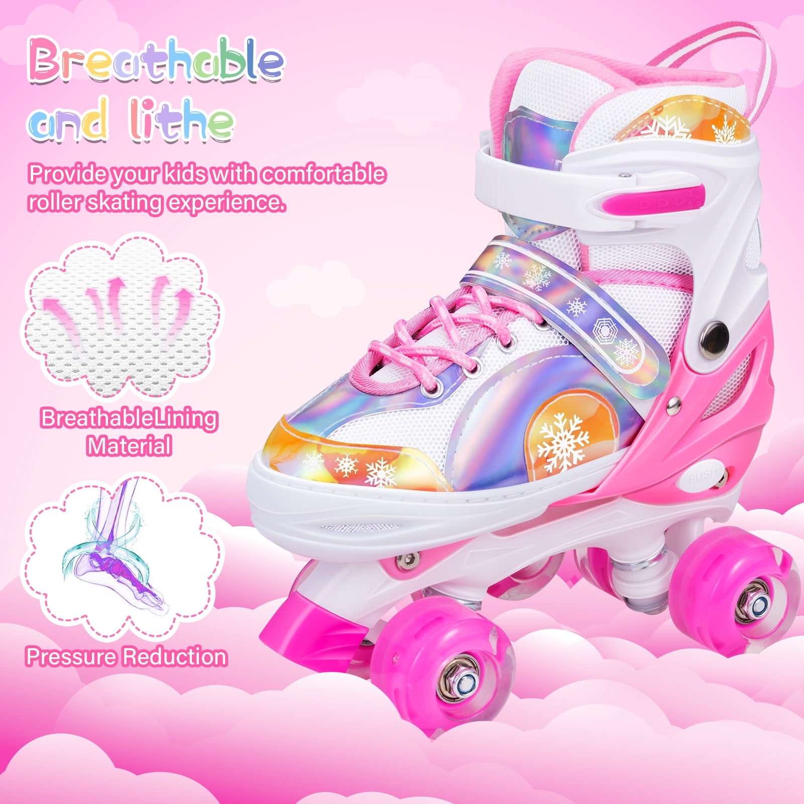 $37.83【Adjustable Roller Skates for Girls】Kids roller skates can be easily adjusted to 4 sizes to accommodate the growth of kid’s foot. Please make sure to choose the correct size by checking the size chart image.S:10.5C-13.5C. M:1Y-4Y. 【Triple Protection System】Our kids roller skates feature safety ratchet buckles, power straps and lace-up closure system ,upgraded brakes help your kids brake in time.We provide two brakes for easy replacement. 【Colorful Light Up Wheels】The four wheels of boys / girls roller skates are designed with glowing colored lights, the lights are powered by the rolling of the wheels,and the battery never needs to be changed! 【Superior Quality and Performance】We use high-quality breathable lining material to ensure optimal comfort .The high-speed silent wheels are wear-resistant and smoother, allowing skaters to enjoy a fast and smooth ride. 【Perfect Gift for Kids】Roller skates is popular among children. Make it a surprise gift for kids birthdays, holidays, Christmas that will make them scream in joy! Choose our roller skates for kids and make them fall in love with skating!