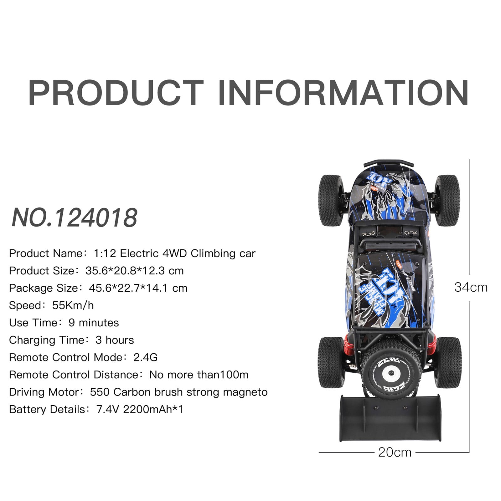 $94.59Wltoys 124018 High-Speed Racing RC Car Speed Thrills: Experience the adrenaline rush with speeds up to 37 mph (60km/h), powered by a super strong magnetic motor. Perfect for the thrill-seeker in you! Advanced 2.4GHz Remote Control: Enjoy interference-free racing with the advanced 2.4GHz radio system. Race multiple cars together without interference. The remote’s control range is up to 328 feet (100 meters). Durable Construction: Built on a high-strength aluminum alloy base for unmatched stability and durability. Equipped with zinc alloy gears for superior wear resistance. All-Terrain Adventure: Ready to conquer any terrain with hardware hydraulic shock absorbers for smooth rides. Whether it’s the beach, snow, grass, mountain roads, or rocky paths, this car handles it all. Effortless Maneuverability: Its powerful torque makes difficult maneuvers seem effortless, providing an exciting yet realistic driving experience. Flexible and Stable: The combination of a 2.4GHz control system, eye-catching design, and a solid aluminum alloy chassis ensures flexibility and stability, enhancing the overall driving experience. Product Details Condition: Brand New Brand: Wltoys Scale: 1/12 Materials: Aluminum alloy, plastic Battery Options: Available in 1, 2, or 3 battery versions Maximum Speed: 37 mph (60km/h) Remote Control Battery: 4*AA (not included) Dimensions: 14.17*8.07*5.51 inches (36*20.5*14cm) Package Includes 1* RC Car 1* Remote Controller 1* Battery 1* Charging Cable 1* Cross Socket Wrench 1* User Manual