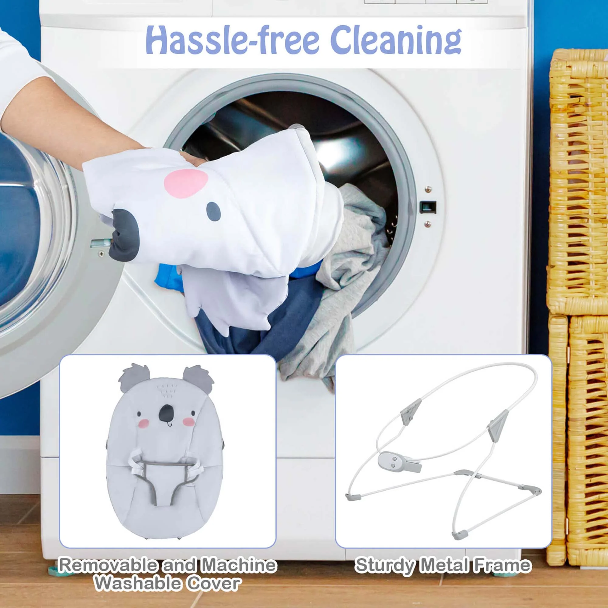 $50.74Original price was: $50.74.$42.99Current price is: $42.99.Comfort your little one with our portable baby bounce! This Costway unisex innovative baby bouncer is designed to move with the babies’ upward and downward movements that will soothe them. It supports different body parts and simulates a nurturing cuddle. Moreover, the music box features 8 melodies as well as adjustable vibration and volume for personalized needs. Also, the infant rocker boasts a removable bar with cute toys for fun. Safety is not to be ignored! Thus, the strong metal frame with an anti-skid base is built. And there is a 3-point safety belt. Furthermore, wrapped in a soft peach velvet fabric that’s gentle on the skin and washable, this soothing chair is a perfect gift for little ones. Feature Natural bouncing for a soothing and comfortable feeling 30° ergonomic design with full-body support for coziness Music box with customizable melodies, vibration and volume for fun Detachable toy bar with 2 adorable toys for delightful play Durable metal frame with anti-slip foot pads for steadiness Designed with child-friendly details like cute ears with sound Skin-friendly seat pad with 3-point safety harness for security Hassle-free cleaning with removable and washable cover A great gift idea for baby showers, birthdays and more NOTE:Required 2x AA battery(not included) Specification Color: Grey Materials: Peach Velvet Fabric, Polyester, Metal, ABS, TPE Overall Dimension: 25″ x 20″ x 23″ (L x W x H) Net Weight: 3.5 lbs Weight Capacity: 20 lbs Recommended Ages: 0-6 Months Old Package Includes: 1 x Baby Bouncer 1 x Instruction