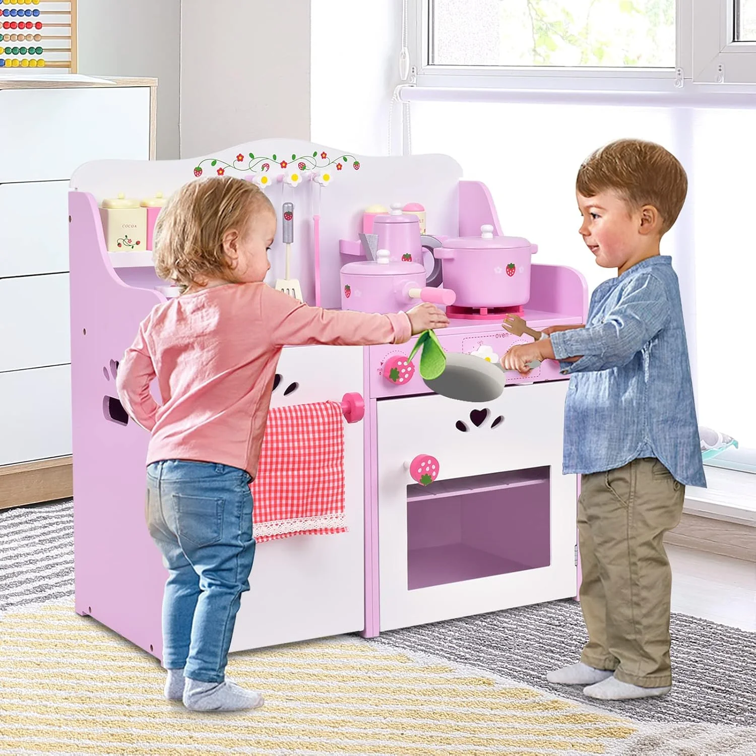 $136.74Original price was: $136.74.$73.09Current price is: $73.09.This kitchen set with its compact stylish and lovely look makes young chefs love it! Realistic details will take make believe fun to the next level! Your child can enjoy making a meal for you, or perhaps ”cooking” dinner right alongside you. There is the storage space available. Use them as functional spaces to hold any added food items, or as tidy storage. It is an ideal present for your kids’birthday, Christmas! They will love to play with their friends and become more active Feature Smart, sturdy construction Non-toxic, environmentally friendly and easy-to-clean paint Fun way to teach kids about cooking Working knobs for extra fun Cute strawberry pattern & knobs Realistic details Large storage space for cooking gadgets when not in use Perfect gift for kids and friends Suitable Age:More than 3 years old Assembly required Specification Color:Pink + White Material:Pine wood + MDF Size:23.6” X11.6 ”X 24.4” ( L x W x H ) Net weight:about 23 Lbs package Includes: 1 x Kitchen Set 1 x Assembly Instruction