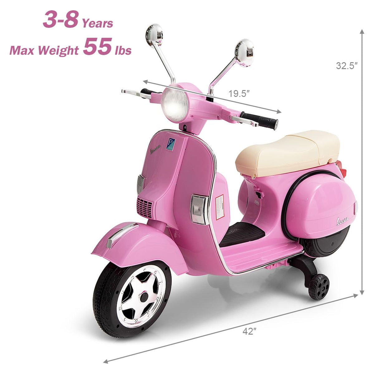 Costway Kids Vespa Scooter, 6V Rechargeable Ride on Motorcycle w/Training Wheels Pink