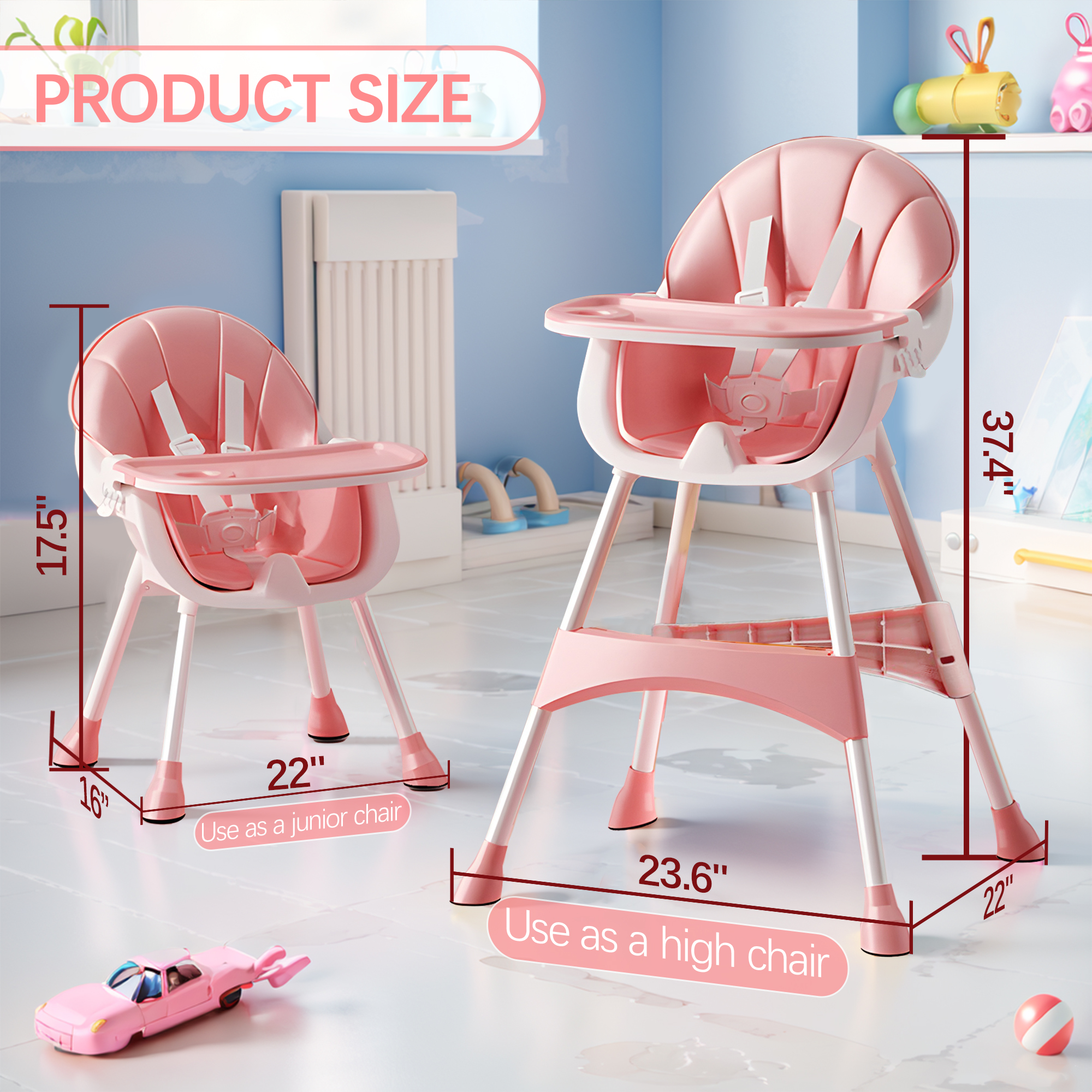 $51.593 in 1 Baby High Chair is made of high quality PP material, which is a great choice for baby shower, birthday gifts, Christmas and other holidays. Removable double seat cover is easy to wipe to avoid dust accumulation. The harness is also easy to remove for daily cleaning. It is dishwasher safe and makes clean up very simple. The unisex feeding chair is also the activity center for boys and girls to play with toys. 【Safe Comes First】The safety and comfort of your little one is our priority, so we made sure the firm pyramid structure, durable and stable thicken steel pipe provide superior stability. The 5-point harness gives your children the greatest safety. 【Skin-friendly Materials】Made of BPA-free thicken painted steel pipe, will not harm your baby’s health. Smooth seats which wrapped in premium thicker leatherette will not harm your child’s delicate skin. All thoughtful designs add comfort and durability for your little one. 【3-In-1 Convertible High Chair】Our chairs are designed to be easily converted into toddler booster seat with guardrails, infant floor table seat, or an ordinary stool. The 3-in-1 design meets the diverse needs of babies at every stage of their growth. 【Easy Installation & Cleaning Process】With detailed instructions, you can quickly finish assembly of this dining chair with ease. The Double layer removable dinner plate is dishwasher-safe, the seat cushion can be scrubbed , and the seat belt can be removable for cleaning. 【3-Position Tray】Our chair contains a 3-position eating tray allows you to choose the best room to fit your baby. Max weight: 15 KG. Appropriate for babies ages 6 months to 3 years old baby