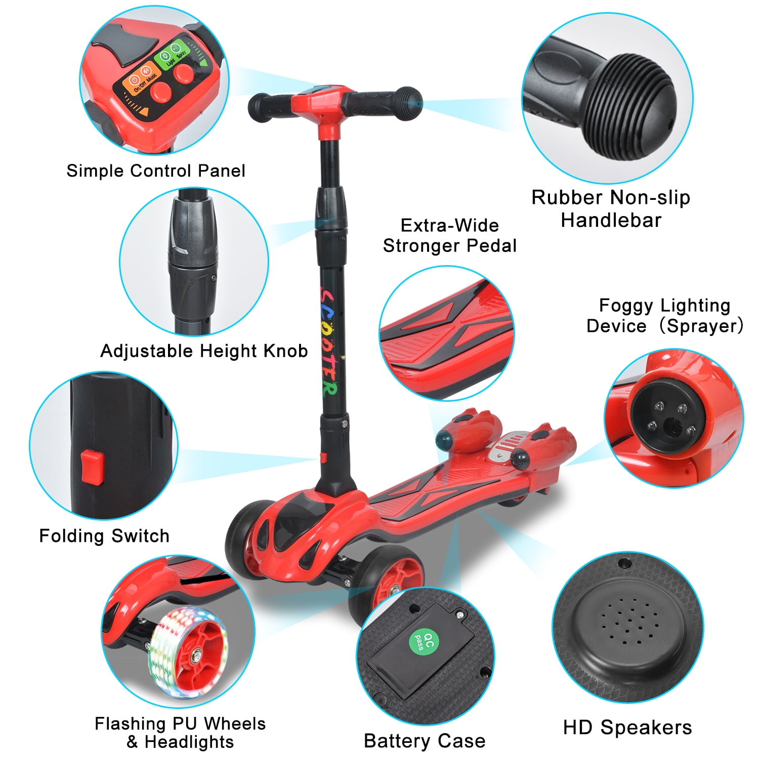 $94.59Original price was: $94.59.$68.79Current price is: $68.79.Specification: Material: ABS + PP Plastic + Aluminum alloy Bluetooth Connection: Yes (Bluetooth 5.0) Barrier-free Distance: 100m Function: Light / Music / Spray In-built Songs: 4 Brake System: Foot Brake Steering Method: Lean to Steer Height Adjustable Level: 3 Levels (66cm / 73cm / 80cm) Max Weight: 60kg Recommended Age: 3-10 Years Old Number of Wheels: 3 Front Wheels Size: 12x4cm Rear Wheel Size: 10x5cm Battery: Lithium Battery 3.7V 2000mAh Tire Type: PU Light up Wheel Charging Time: 4 Hours (USB Charging Line) Charging Requirement: AC 100-240V, 50-60HZ Assembly Required: No Unfolded Size: 60x30x66/73/80cm 25.89*23.63*11.82INCH Folded Size: 68x30x16cm Deck Width: 12cm Deck Thickness: 3.5cm Product Weight: 4.1kg Package Size: 65*17*28cm/25.59*6.69*11inch Package Weight:4.5 Kg Packing List: 1 x kids Scooter 1 x USB Charging Cable 1 x Plastic bottle 1 x Instruction Manual 1 x Screwdriver 4 x Screws (2 for spare screws) 2 x Anti dust Plug for USB charging port Product Warranty: 1 Year Warranty (If you have any question, please feel free to contact us, solved within 24 hours.)