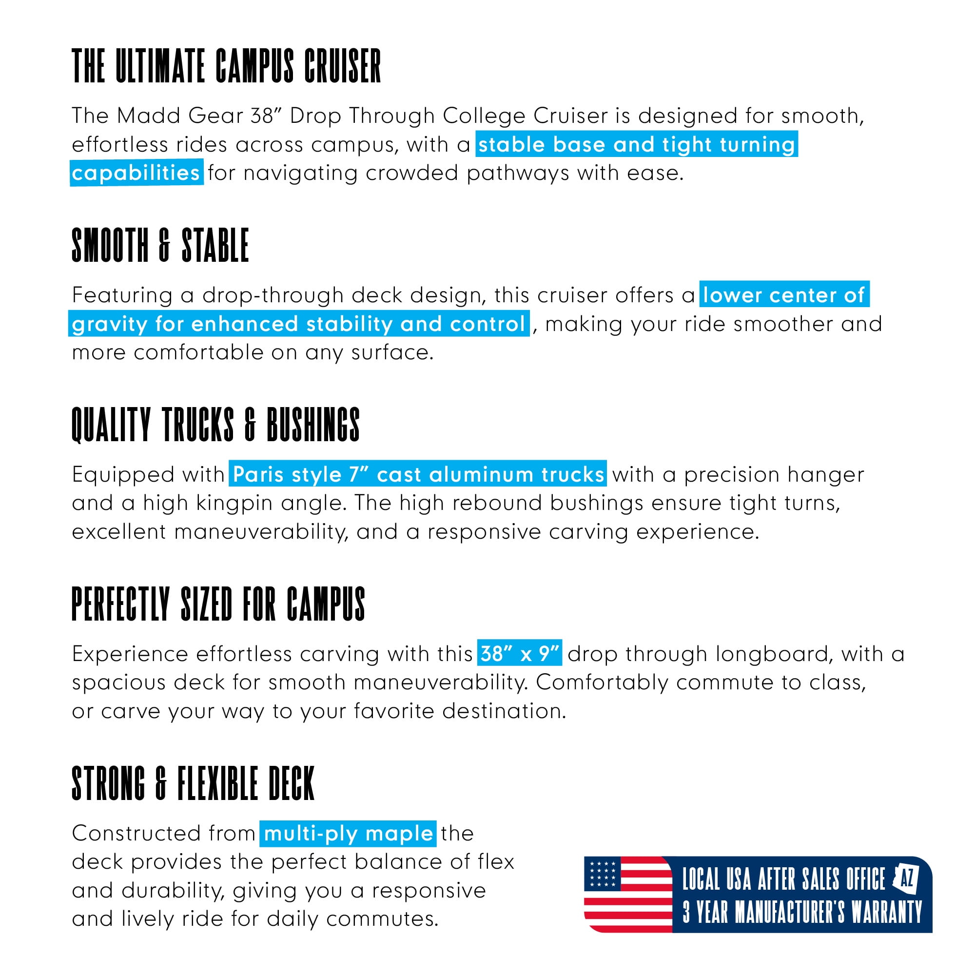 38″ Drop-Through Longboard Cruiser – Maple Deck, 70mm PU Wheels, ABEC-9 Bearings – Madd Gear