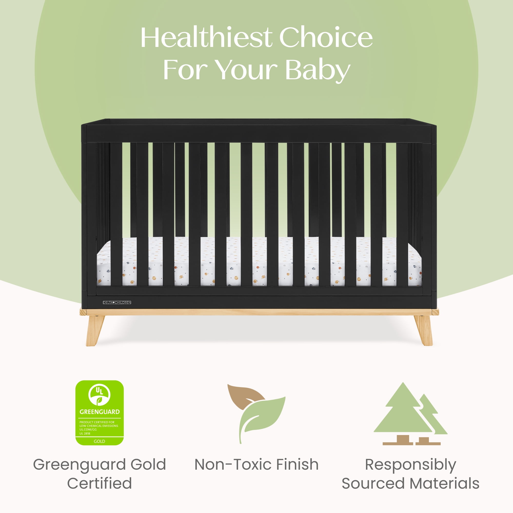 Delta Children Frankie 4-in-1 Convertible Crib – Greenguard Gold Certified, Black with Natural