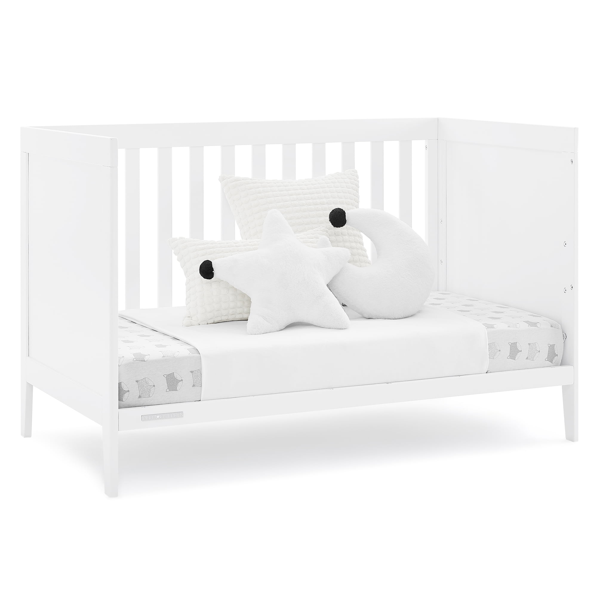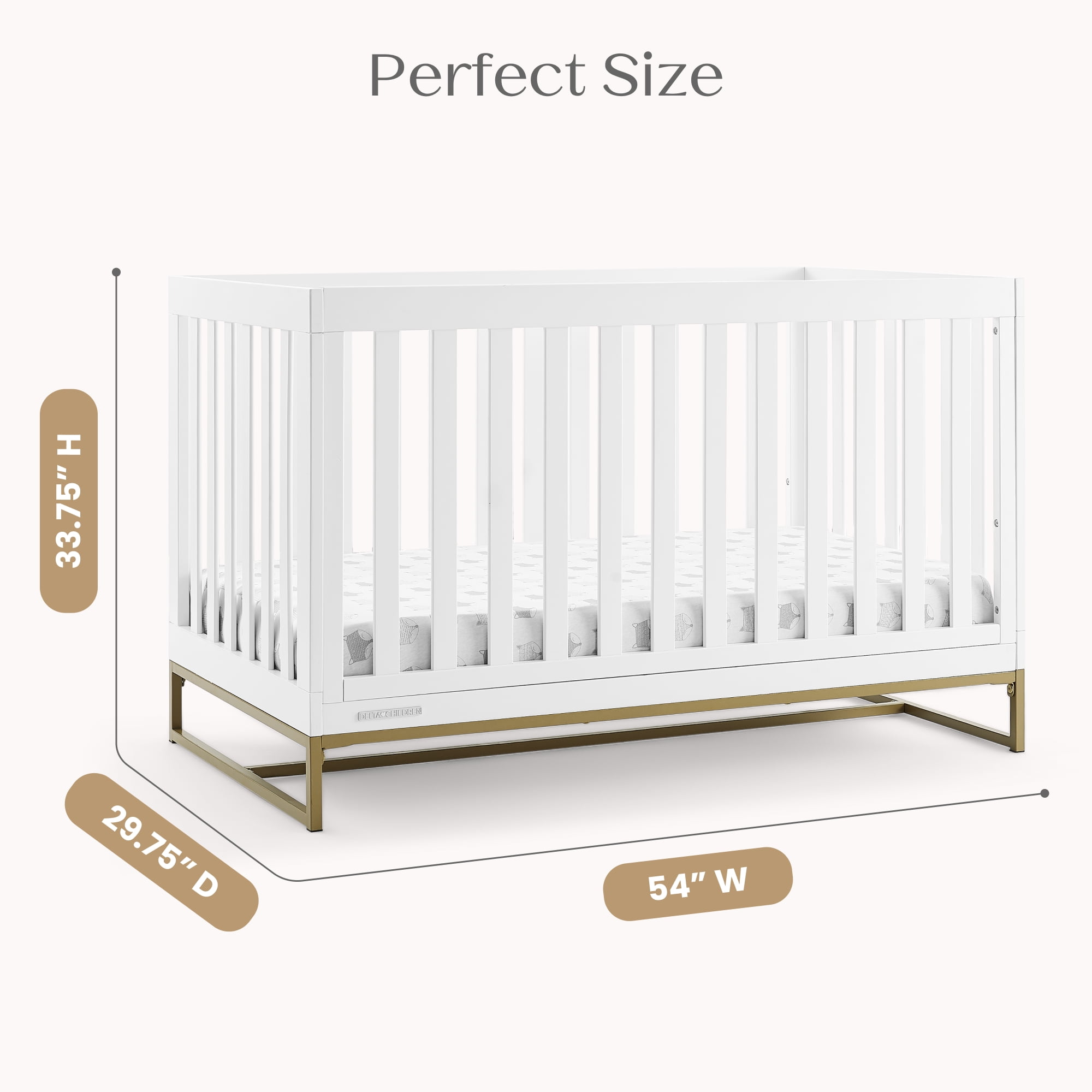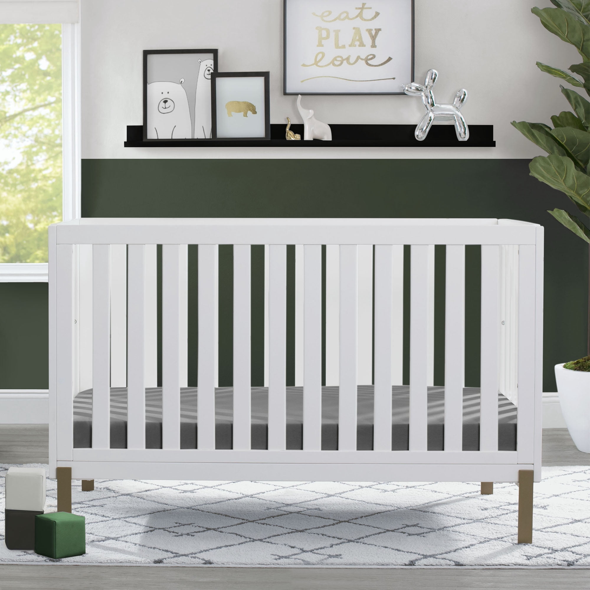 $171.99Shake things up in your nursery with the mixed material design of the Hendrix 4-in-1 Convertible Baby Crib by Delta Children. The pine wood construction brings warmth while the shiny bronze legs add a modern, rock and roll flair. Designed to accommodate your growing child, this crib features a three-position adjustable mattress support. Set the mattress at the highest height for your newborn baby, and lower when they begin to sit or stand. And thanks to an easy-to-use Toddler Guardrail #0094 (sold separately), this crib isn’t just a bronze beauty, it’s the only bed your little one will need. Transform it into a toddler bed when the time is right, and then to a stylish daybed when they’re ready for a little more independence. Underneath the crib there’s enough space to fit the coordinating Under Crib Roll-Out Storage Unit #W100950-130 Bianca White or #W100950-1360 Midnight (sold separately). Delta Children was founded around the idea of making safe, high-quality cribs affordable for all families. That’s why all Delta Children cribs are JPMA certified, and are tested above and beyond industry standards.