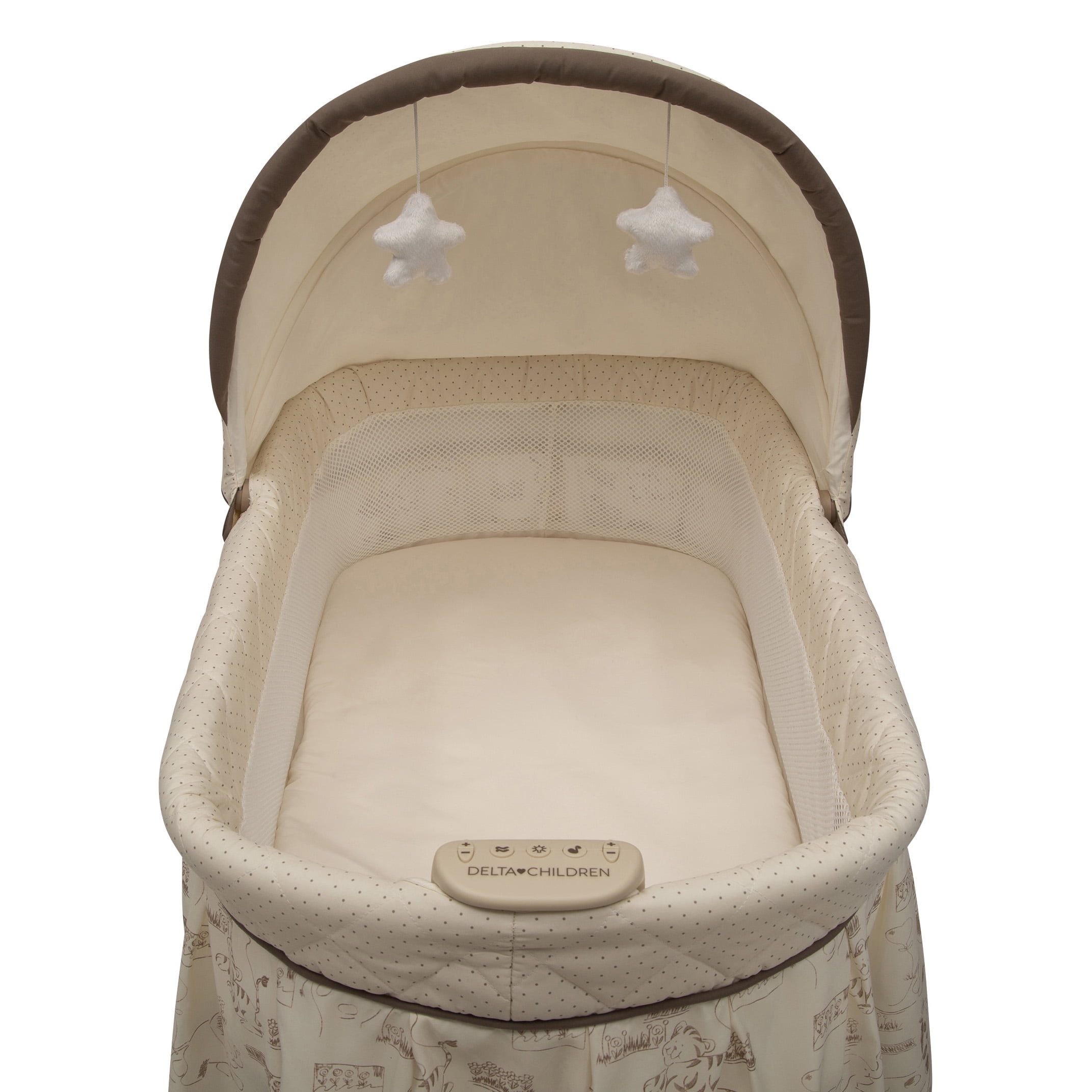 $71.96Original price was: $71.96.$60.19Current price is: $60.19.The adorable Rocking Bassinet by Delta Children is perfect for keeping your little one close to you during the early months. It features a jungle-inspired design theme with soft, neutral colors. As beautiful as it is practical, Delta Children’s Rocking Bassinet in Playtime Jungle features two plush toys hanging from the canopy and an electronic pod that will lull little ones to sleep with soothing music, gentle vibration, and a soft nightlight. Its rocking base adds another layer of comfort-activate the rocking motion with a gentle push. Wheels make it easy to move this beige baby rocking bassinet from room to room. A large mesh storage basket provides ample space to store all your baby essentials. This Delta baby bassinet comes with a mattress pad and matching sheet.