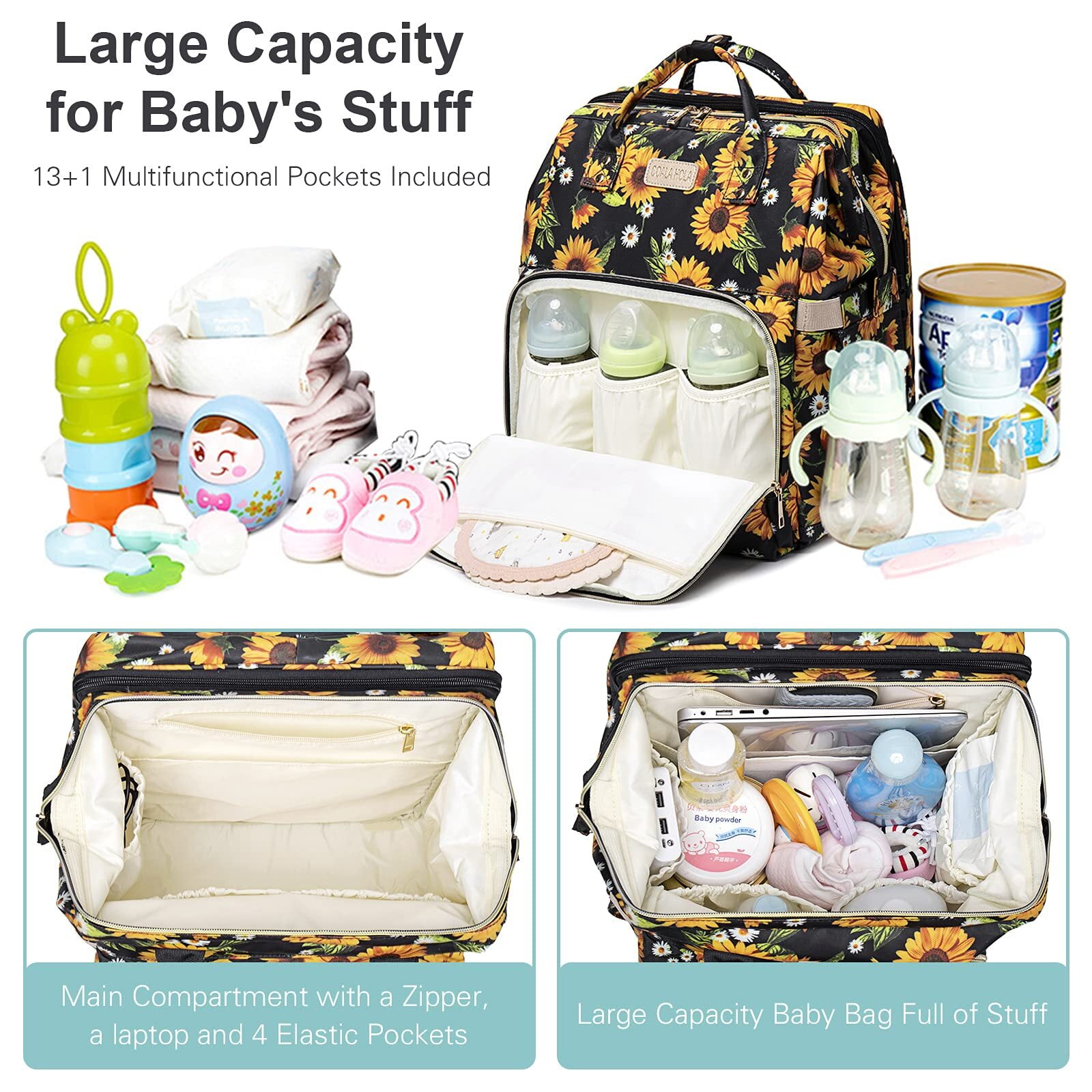 Diaper Bag Backpack, Multifunction Waterproof Travel Backpack with Foldable Crib, Insulated Milk Bottle Pocket & USB Charging Port & Stroller Strap, Sunflower