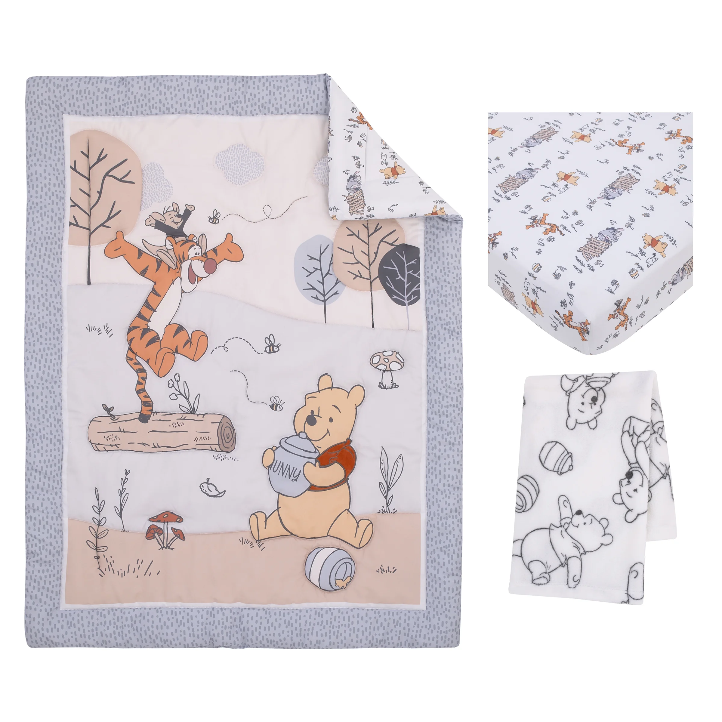 Disney Winnie the Pooh 3-Piece Crib Bedding Set, Gray, Comforter, Fitted Sheet, Blanket, Infant Boy or Girl