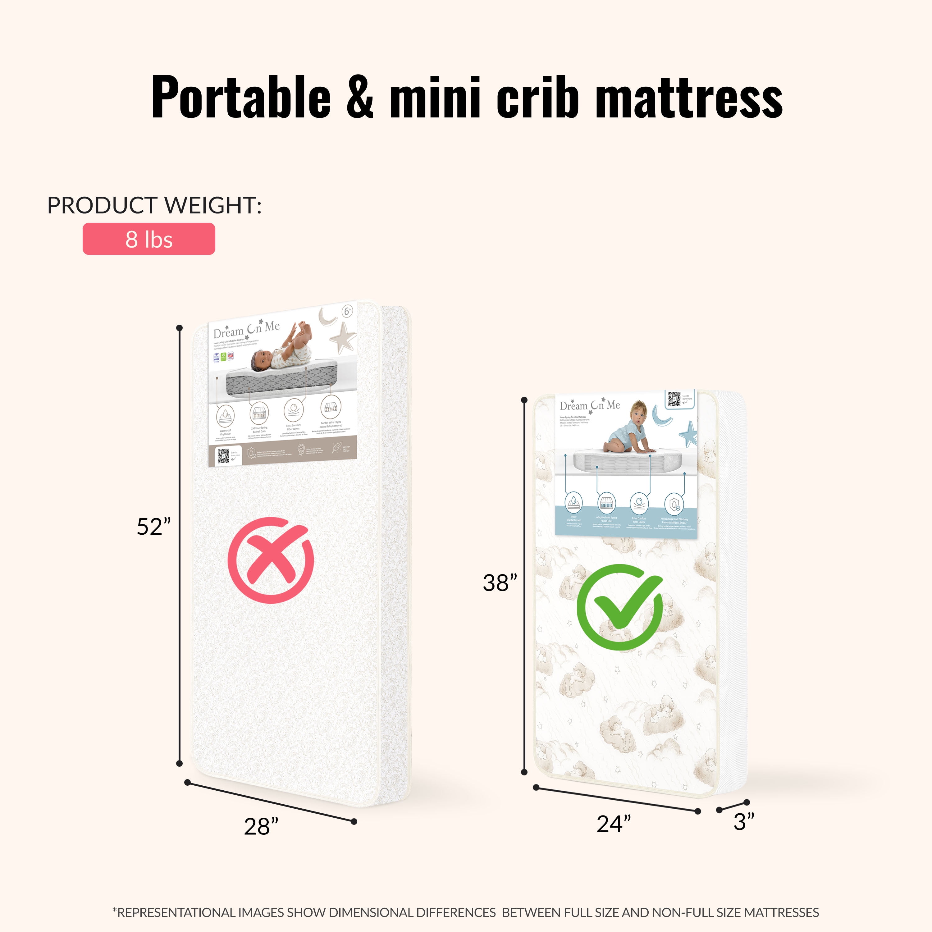 $41.22Dream On Me 2-In-1 Breathable Two-Sided Portable/Mini Crib Innerspring Coil Mattress for newborn, infant, and toddler. Dream On Me mattress meets the Federal Flammability Standard, rest easy knowing this mattress is tested for phthalate and lead and constructed with quality materials and workmanship. Easily wipes clean with mild soap and water. Product Dimensions: Length 28″ x Width 24″ X Height 3″