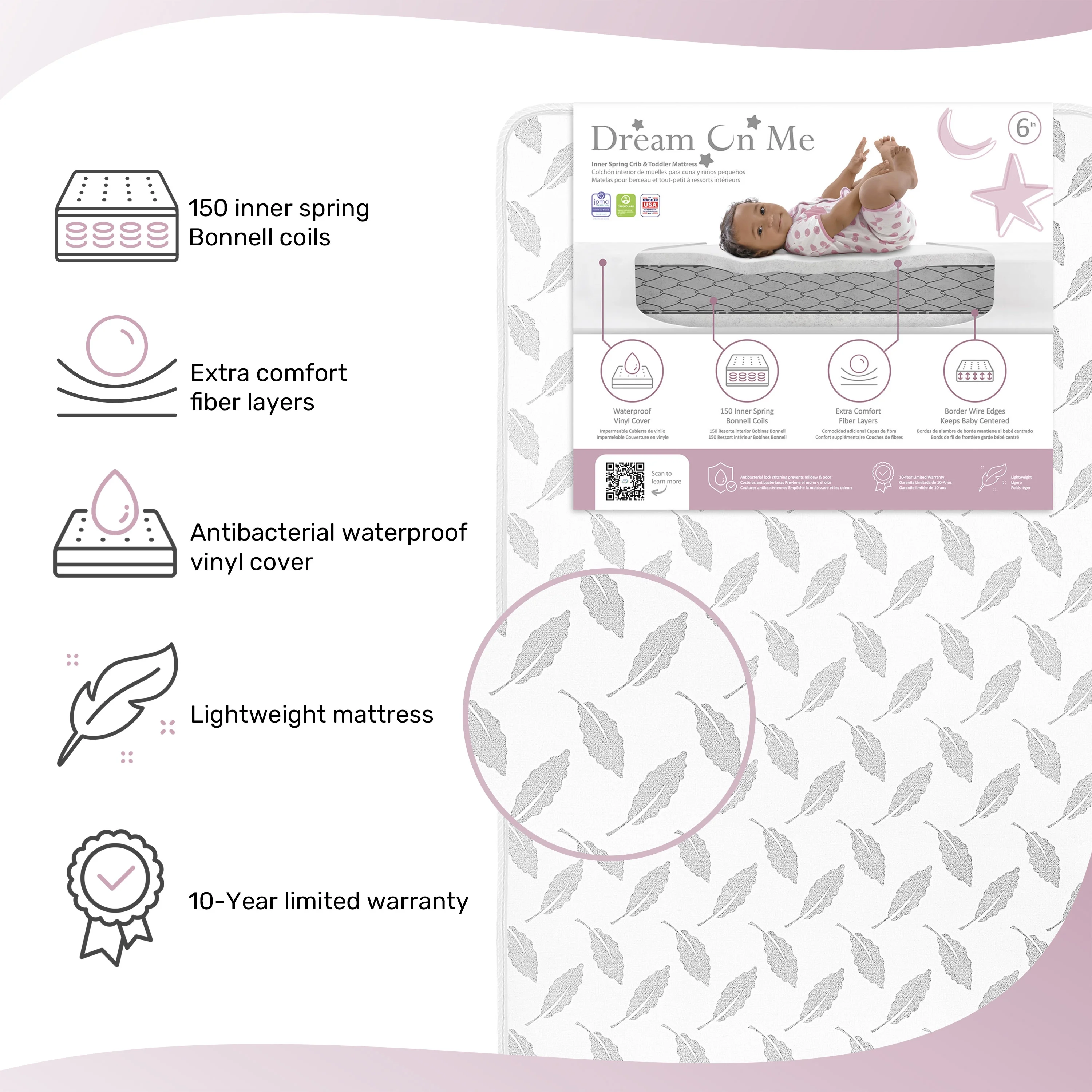 $55.52Dream On Me, Flora 132 Premium Coil innerspring mattress provides the support babies and toddlers need for a good night’s sleep. This lightweight mattress offers 132 durable, interwoven, heat tempered, steel coils providing supreme comfort and support. A protective polyurethane fiber wrap on each side delivers a plush sleeping surface. Features include a hypo-allergenic, fiber Insulating layer, and lock-stitched waterproof binding for lasting.
