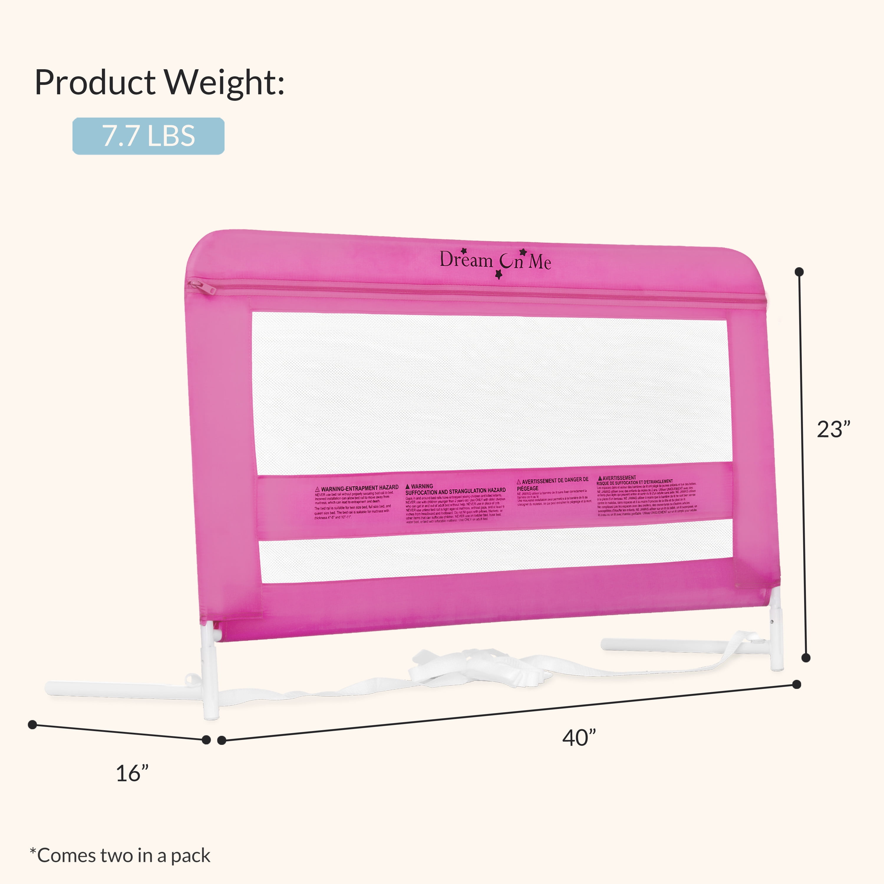 $42.99Introducing the practical Dream On Me Lilibet Twin/Full/Queen Mesh Safety Toddler Bedrail, double pack that’s the perfect, secure fit to any adult twin or queen size bed The Lilibet Safety Bedrails come with a reinforced anchor system and no-catch edges. The bedrails also come with a breathable mesh fabric, sturdy metal frame and a stabilizer bar. The Bedrails can be assembled in seconds with no tools, and adjust to fit an adult twin, full and queen size mattresses with a minimum height of 11” (inches). It’s available in classic finishes to match with your nursery decor/theme. Dimensions: 40” L x 1” W x 23” H (inches). Weight: 3.85 lbs.