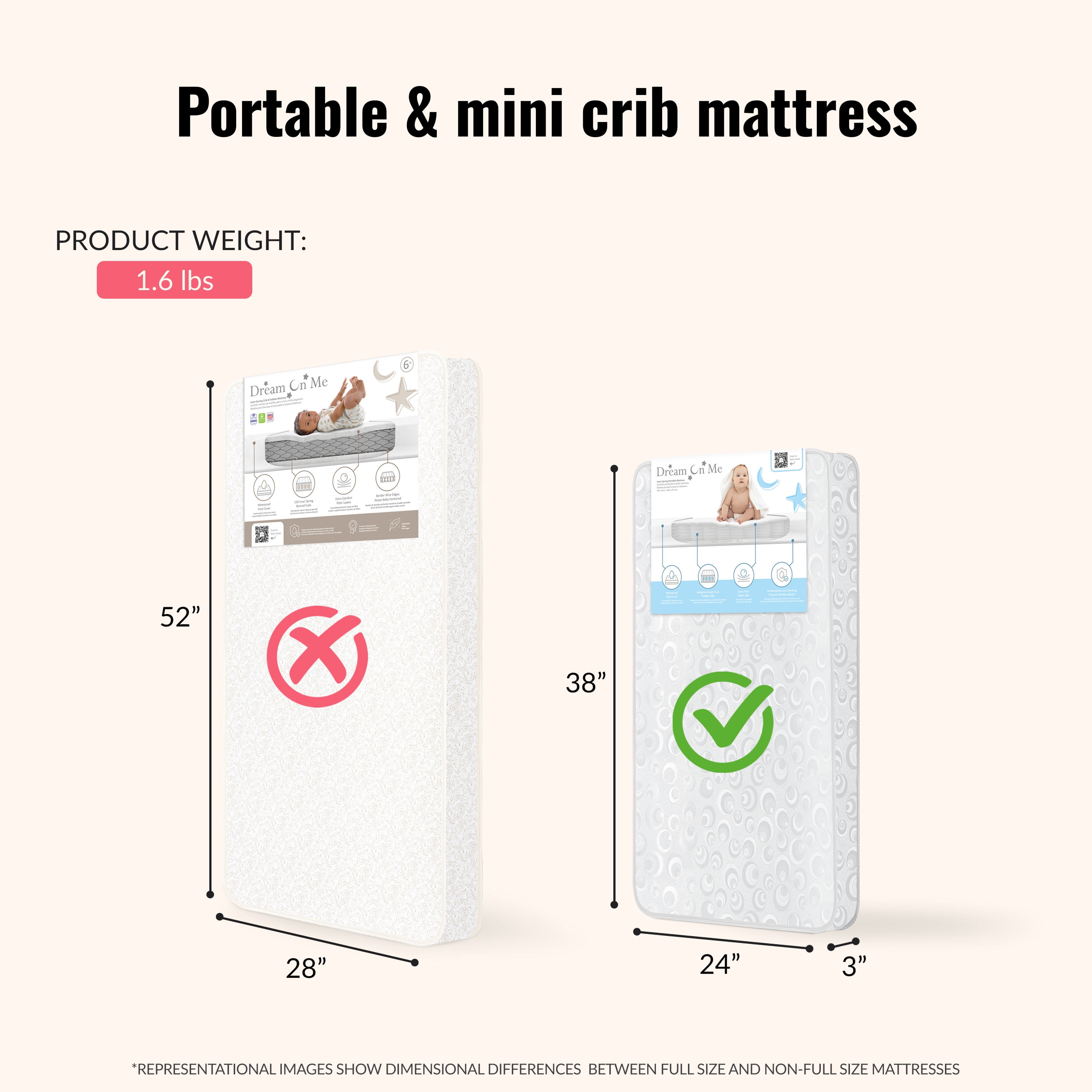 $28.13Dream On Me, 3 Spring Coil Mini/Portable Crib Mattress In White is of supreme comfort and quality for newborn, infant and toddler. You no longer need to purchase a standard size crib to get the comfort and support of a full-size mattress. This Portable/Mini crib mattress features interwoven steel coils that are wrapped in hypoallergenic, polyurethane foam and protected with a waterproof cover with Lock Stitch venting. The waterproof, hypoallergenic, antibacterial, cover aids in the prevention of mold, mildew and odor and easily clean with a cloth with warm water and mild soap. This mattress passes the Federal Standard Flammability Standard 16 CFR 1633. Designed to fit a standard 24” x 38” Portable/Mini Crib.