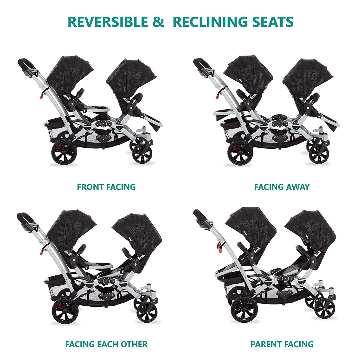 $268.31Taking two kids out on a stroller ride is a breeze, thanks to the Dream On Me track tandem stroller. The front seat has an adjustable footrest with one-position seat recline while the rear seat can recline three different positions. The reversible seats let your kids be front facing, parent facing or face each other – They can play while you can run your errands. Both front and rear seats have a 5 point safety harness. Dual front swivel, lockable wheels with suspension ensure superior maneuverability and a handy foot break in case you lose hold of the handle makes the stroller more secure. The large storage basket underneath can hold toys, groceries, and diaper bags. The parent tray is perfect to keep keys, money handy, and also has two cups for holding drinks. The track stroller folds flat for easy storage and travel – The storage latch auto-locks to keep it folded. The large adjustable canopy has a window allowing you to look It at the kids and provides shade. The stroller features a lightweight aluminum frame with high-end anodizing treatment. Product dimensions: 55Lx26Wx41H inches Folded Dimensions are 22Lx26Wx41H inches. It weighs 41 lbs. And is available in light grey and Black. See more