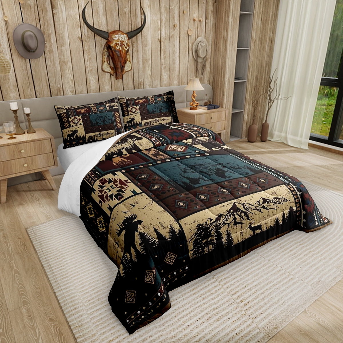 Erosebridal Farmhouse Deer Comforter Sets Southwestern Bedding Set King Size Rustic Hunting Animal Quilt Moose Deer Down Comforter with 2 Pillow Sham Bedroom Decor