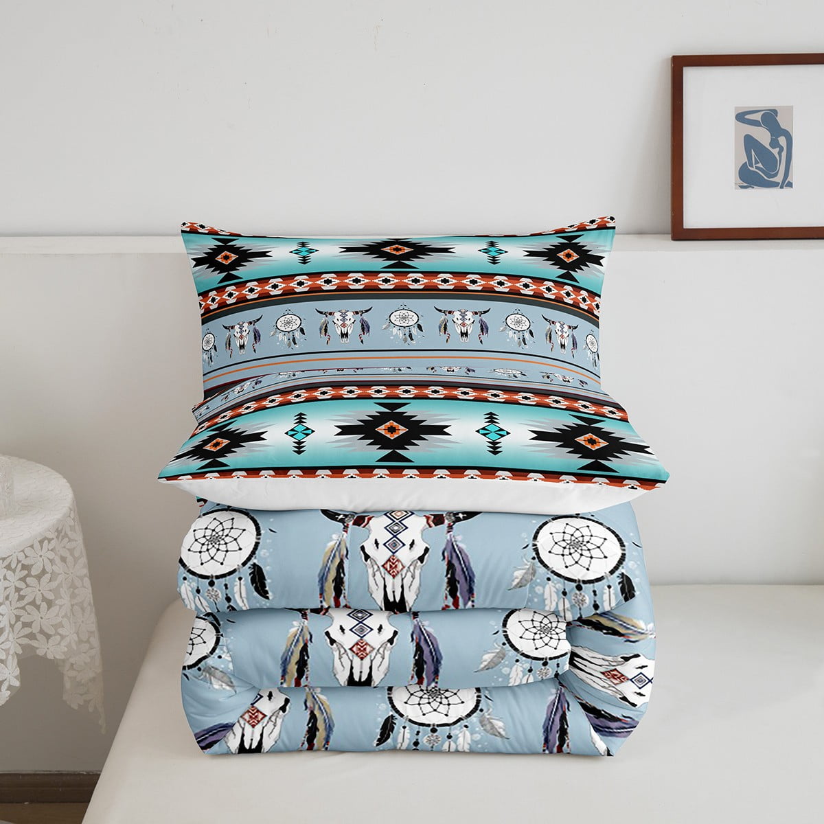 Erosebridal Western Bedding Sets Full, Exotic Bull Skull Full Comforter Set Southwestern Quilt,Dream Catchers Tribe Feather Duvet Insert Western Animals Boho Aztec Western Decor Blue Teal Orange